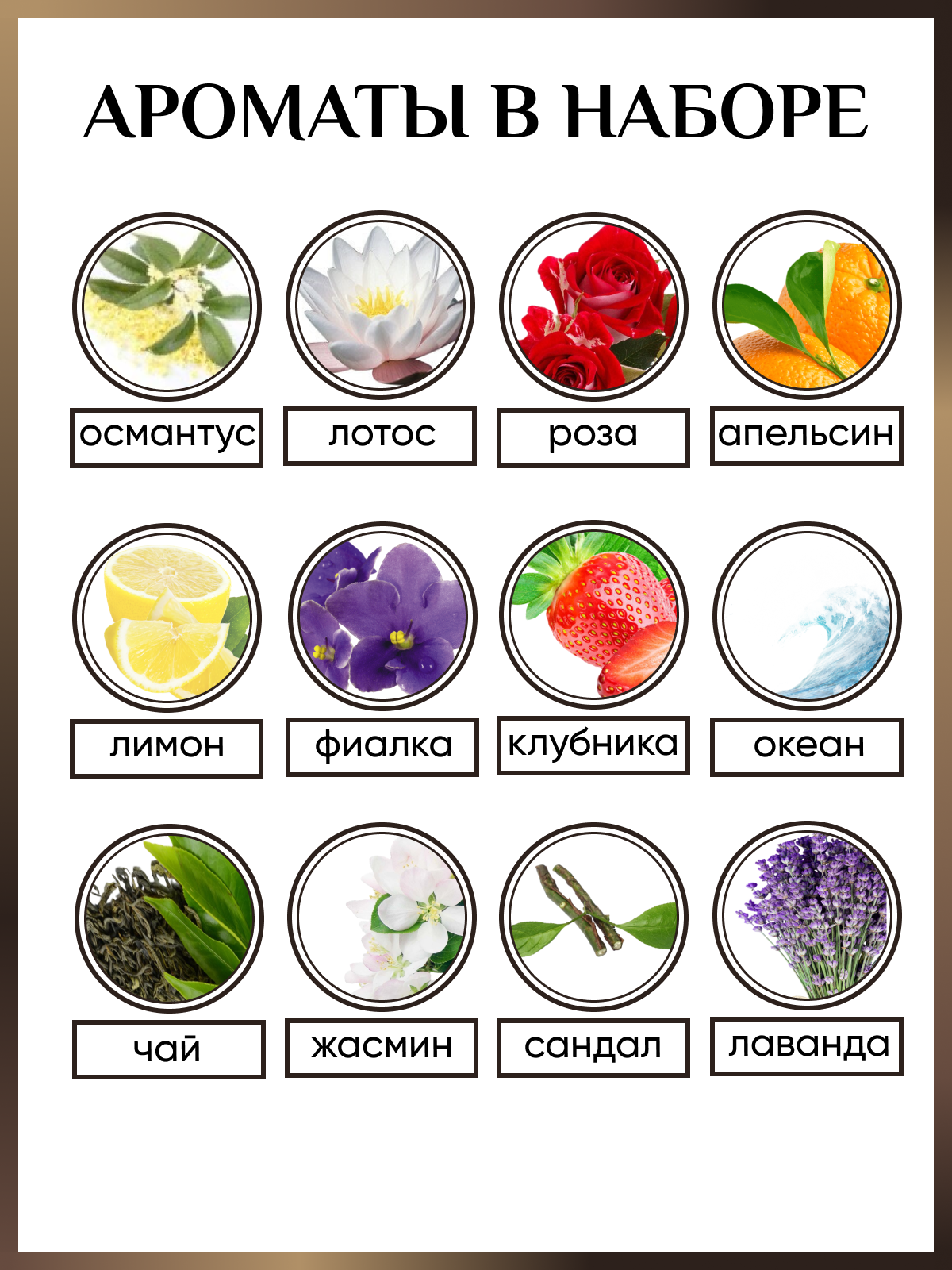 | Аромат | апельсин / жасмин / клубника / лаванда / лимон / лотос / роза / сандал / свежесть / фиалка / цветочный / чайное дерево |
