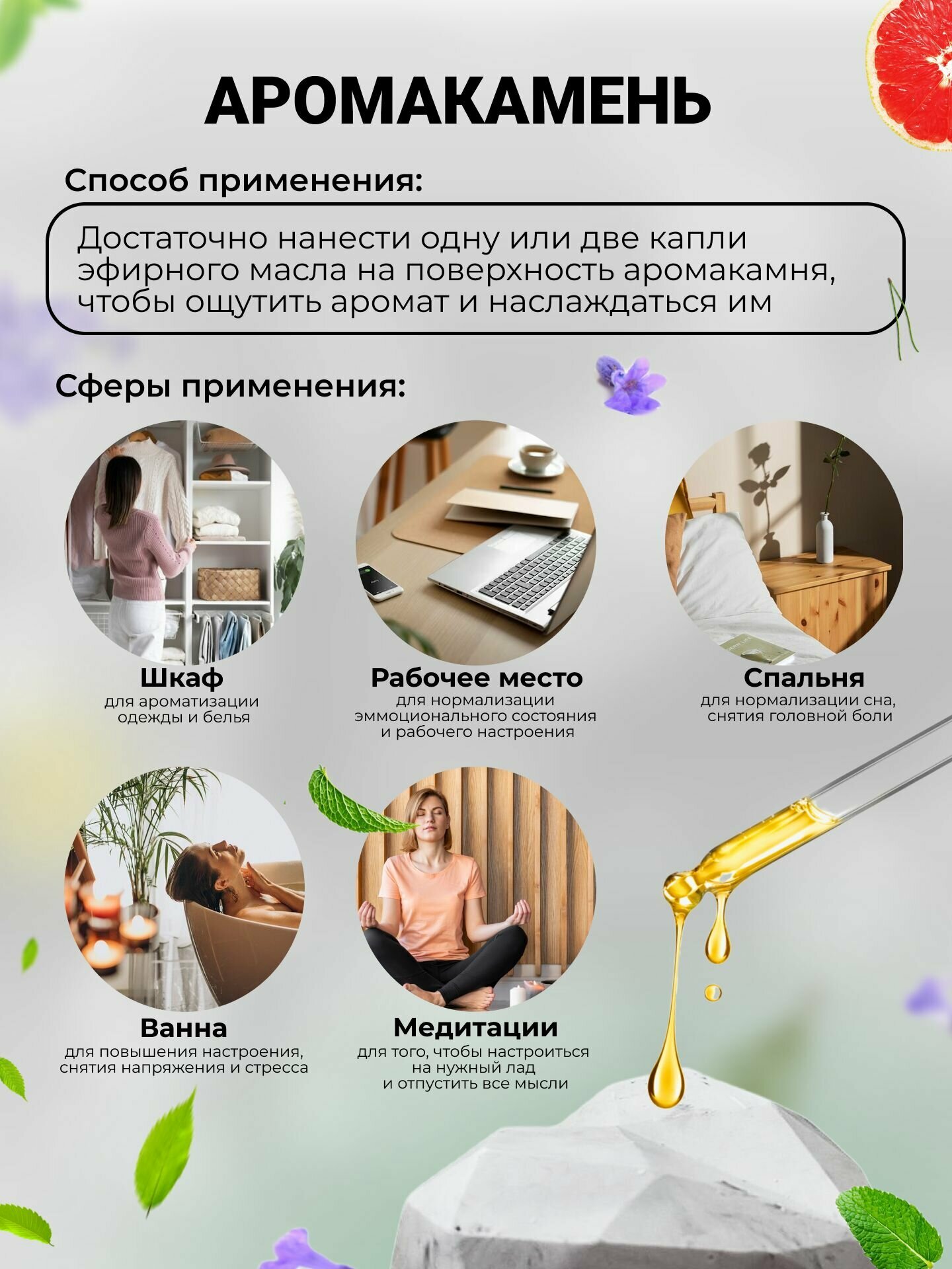 | Способ применения | Аромакамень: 2-3 капли на поверхность Аромалампа: 2-3 капли в горячую воду на 15м2 помещения Аромаванны: 4-5 капель на ванну, предварительно развести масла в столовой ложке эмульгатора (Нейтральный гель для душа или гидрофильное масло), растворить под струей воды. Продолжительность процедуры 15-20 минут. Аромакамни и кулоны: 1-2 капли, время ароматизации ограничить получасом. Массаж точечный или локальных зон: 3 капли на 15 мл (3 чайные ложки) базового масла. Подходит для изготовления ароматов для дома и текстиля. |