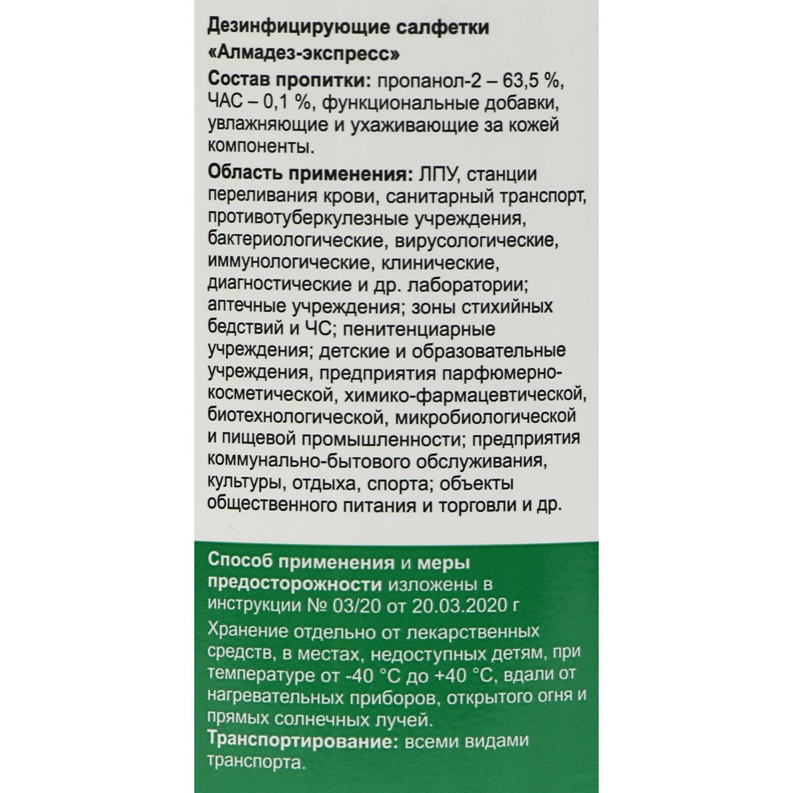 | Условия хранения | хранят салфетки в крытых вентилируемых складских помещениях в плотно закрытой упаковке производителя, в соответствии с правилами хранения легковоспламеняющихся жидкостей, отдельно от лекарств, в местах, недоступных детям, при температуре от -40 °с до +40 °с, вдали от нагревательных приборов (не менее 1 м), открытого огня и прямых солнечных лучей |
