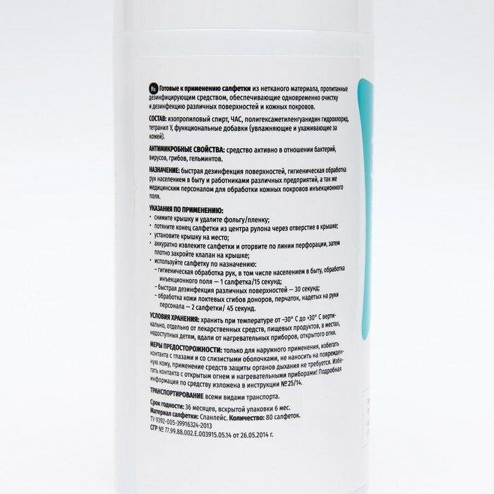 | Состав | изопропиловый спирт 65,4%, алкилдиметилбензиламмоний хлорид 0,25%, полигексаметиленгуанидин 0,04%, тетранил У 0,05%, функциональные добавки |