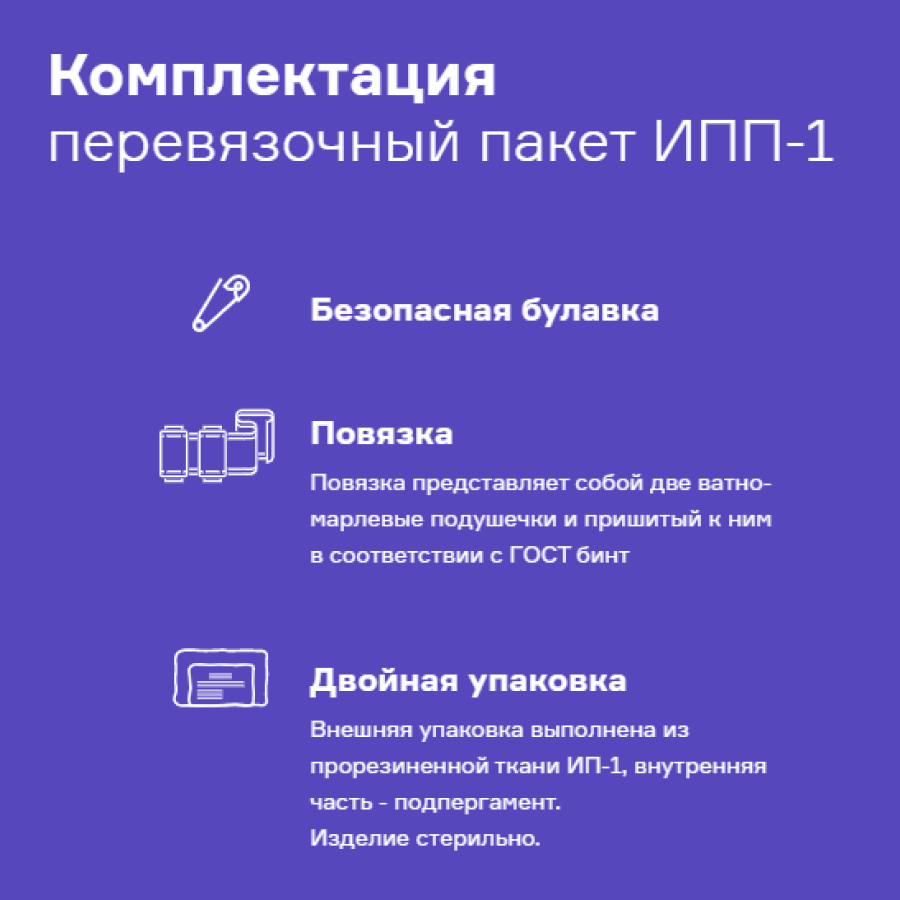 | Дополнительная информация | Индивидуальный перевязочный пакет ИПП-1 с 2мя подушечками ГОСТ 1179-93 ООО ПКФ "Пионер". |