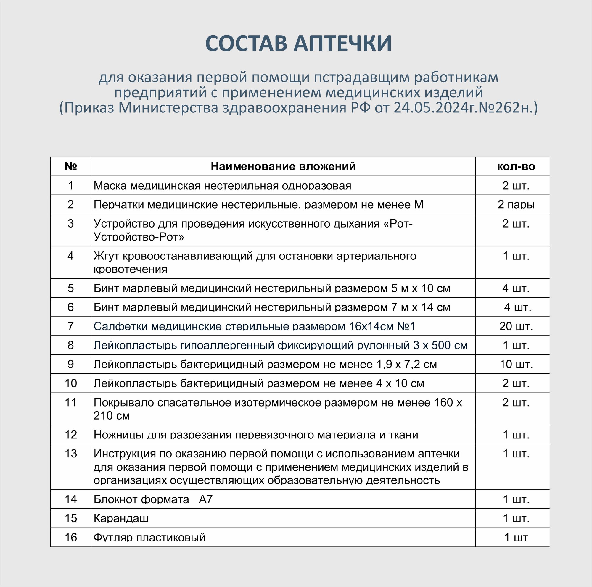 Аптечка для оказания работникам первой помощи по Приказу №262н (старый 1331н) 1 интересное: