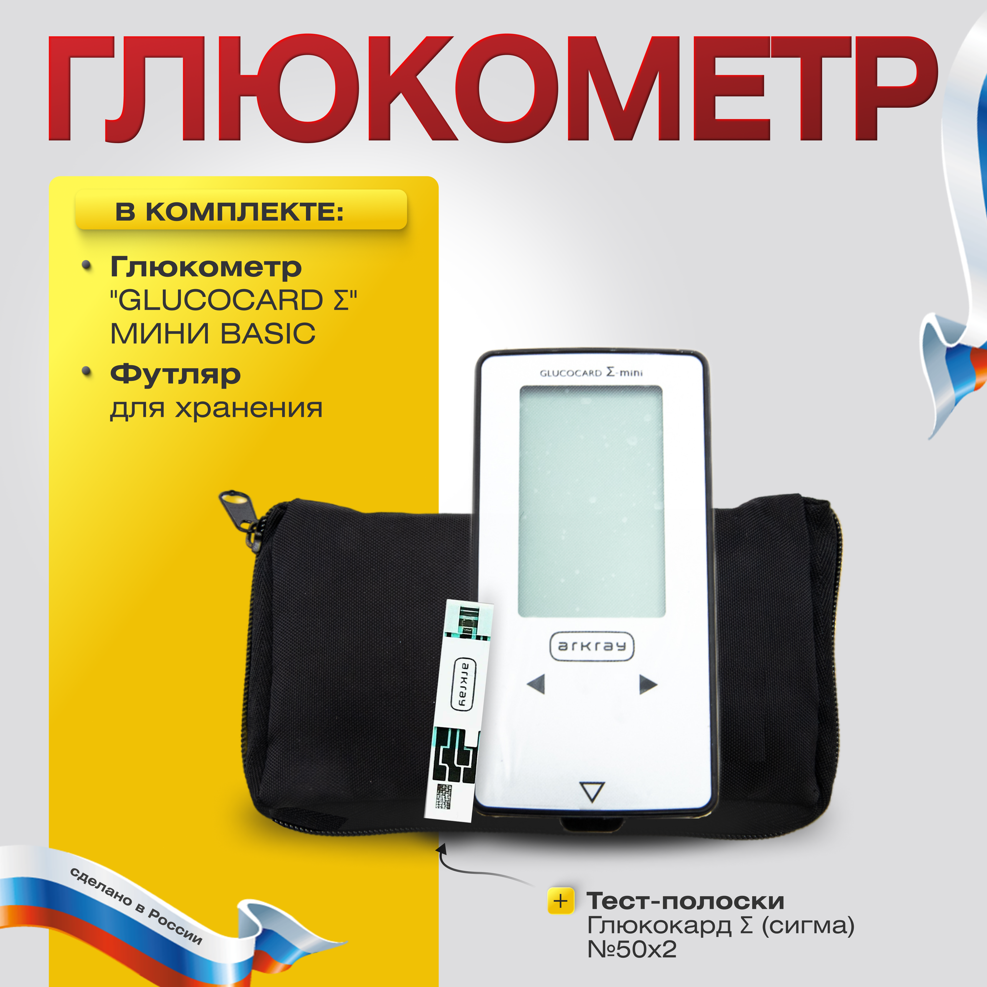 Набор: Глюкометр для измерения уровня глюкозы "GLUCOCARD Σ " мини BASIC +Тест-полоски Глюкокард Σ (сигма) №50х2 интересное: