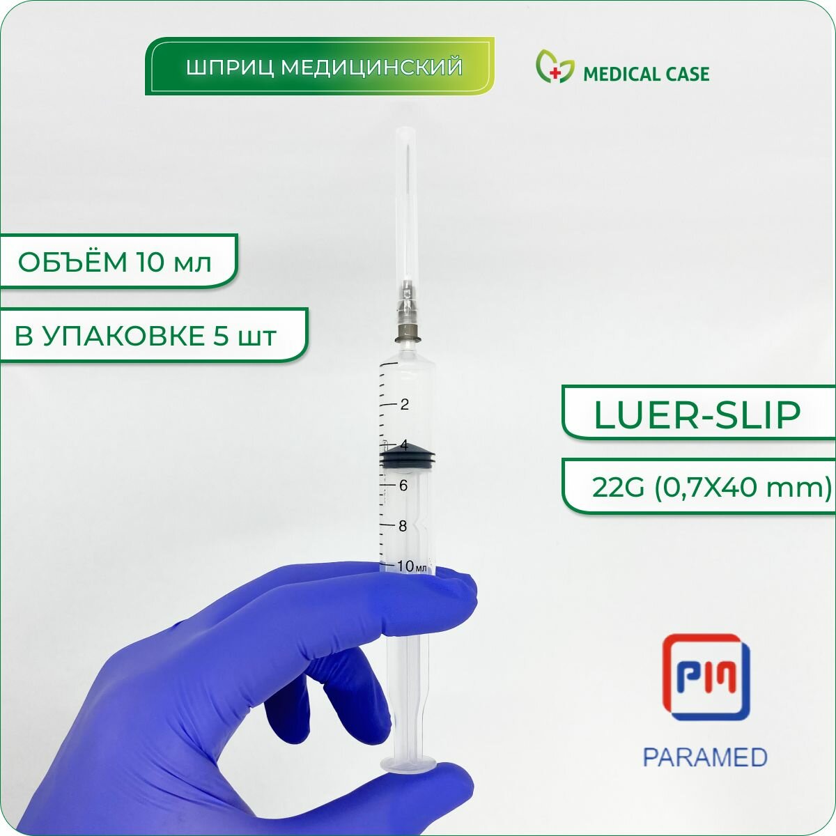 Шприцы PARAMED LUER SLIP 10 мл с иглой 22G (0,7х40) мм, 10 шт, одноразовые, стерильные