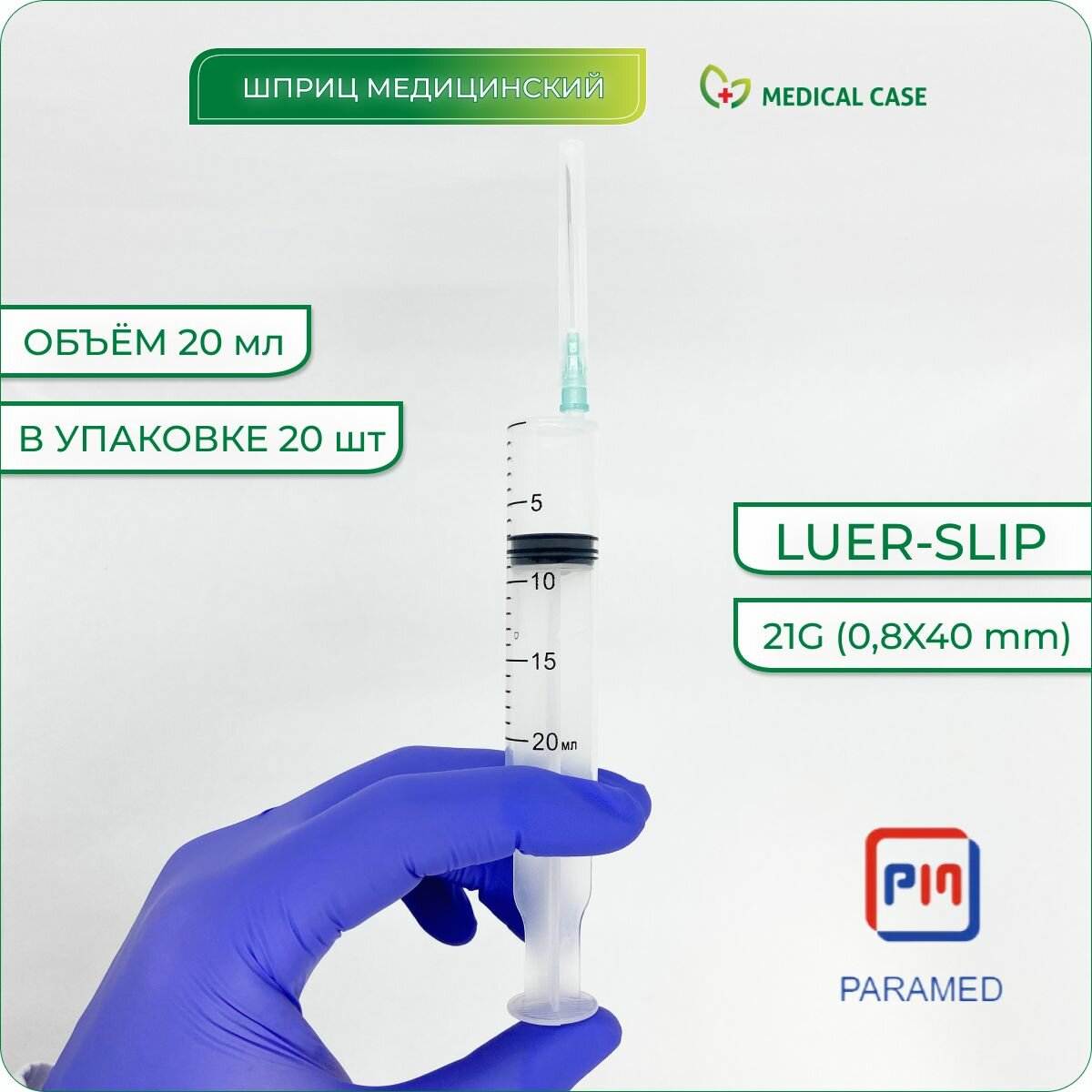 Шприцы PARAMED LUER SLIP 20 мл с иглой 21G (0,8х40) мм, 10 шт, одноразовые, стерильные