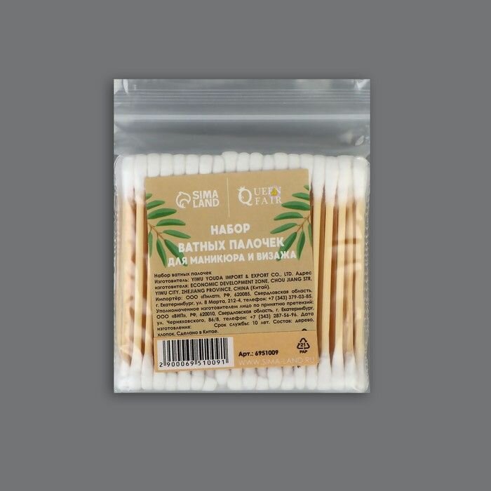 Купить Ватные палочки Queen Fair на деревянной основе 7см в пакете, 100 шт