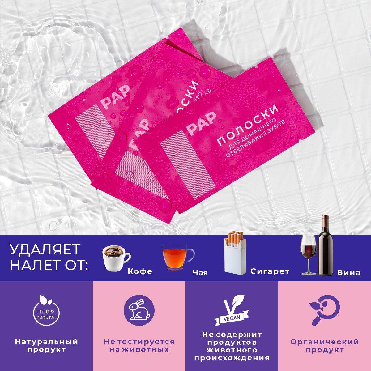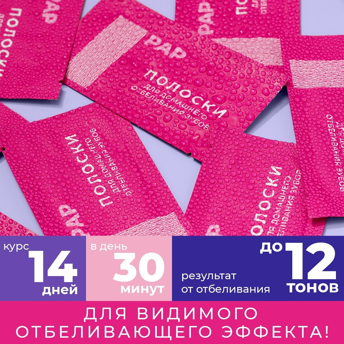 | Способ применения | обычное использование: 1 раз в день по 30 мин., в течение 14 дн. Интенсивный курс: 2 раза в день по 30 мин., в течение 7 дн. шаг 1. Разорвите пакетик из фольги, чтобы извлечь две полоски для отбеливания зубов. шаг 2. Вытрите зубы насухо полотенцем и прислоните первую полоску к нижним зубам, затем таким же образом прислоните вторую полоску к верхним зубам шаг 3. Держите полоски на зубах в течении 30 минут. Нельзя пить и есть. шаг 4. Отклейте отбеливающие полоски и выбросите их в контейнер для мусора. шаг 5. После сеанса воздержаться на 1 час от красящих продуктов и напитков |