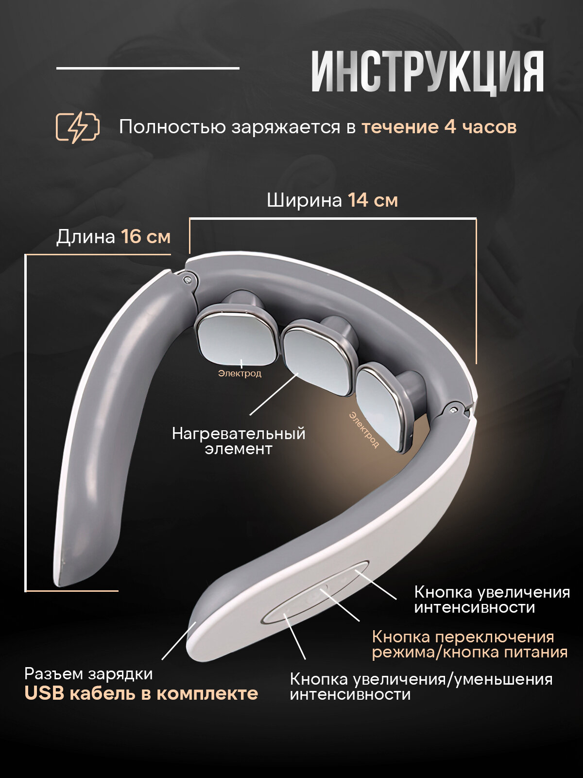 | Дополнительная информация | Перед использованием необходимо смочить водой или токопроводящим гелем заднюю поверхность шеи для лучшего контакта и проводимости. |