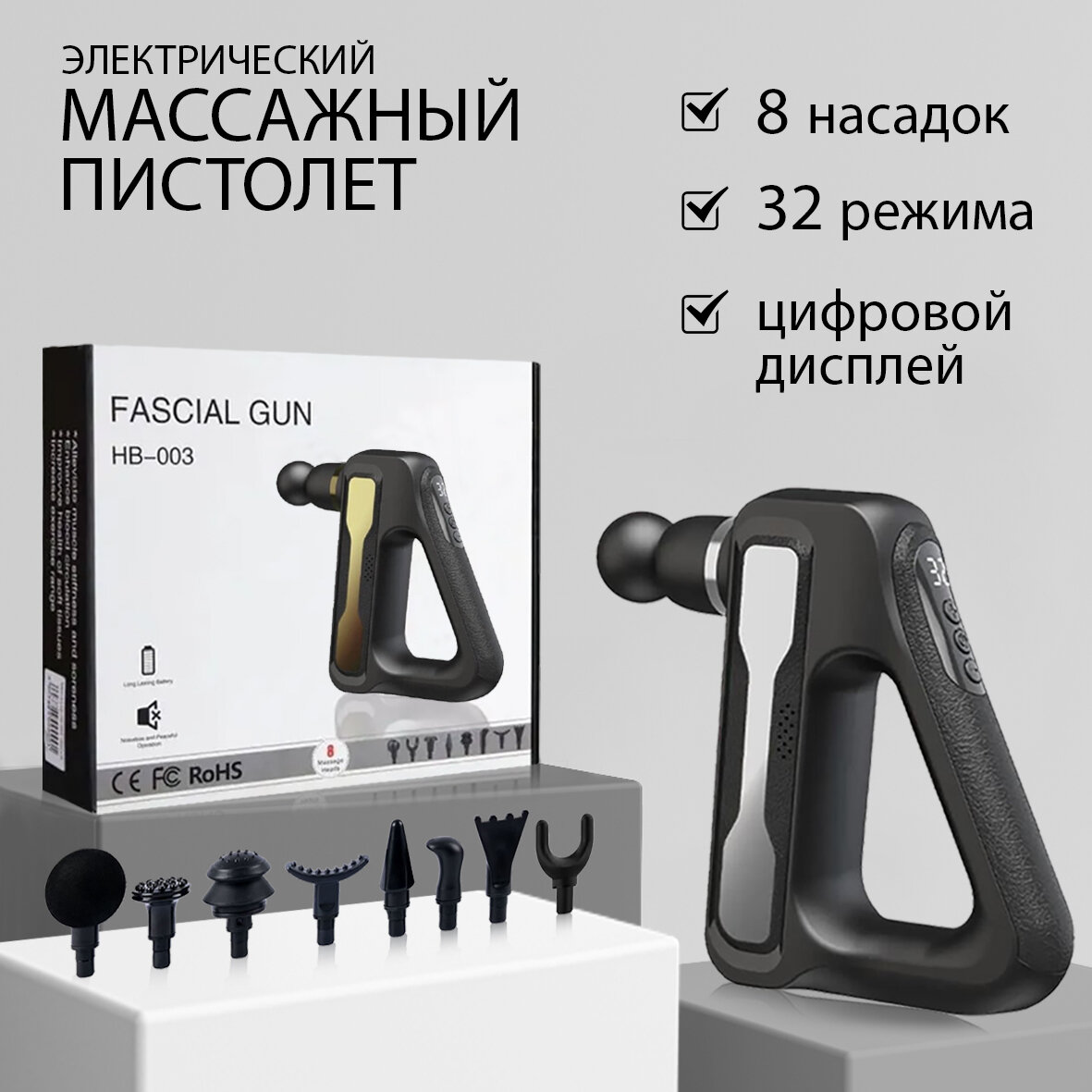 Массажер для всего тела Fasical Gun HB-003, 8 насадок, 32 уровня, цифровой дисплей интересное: