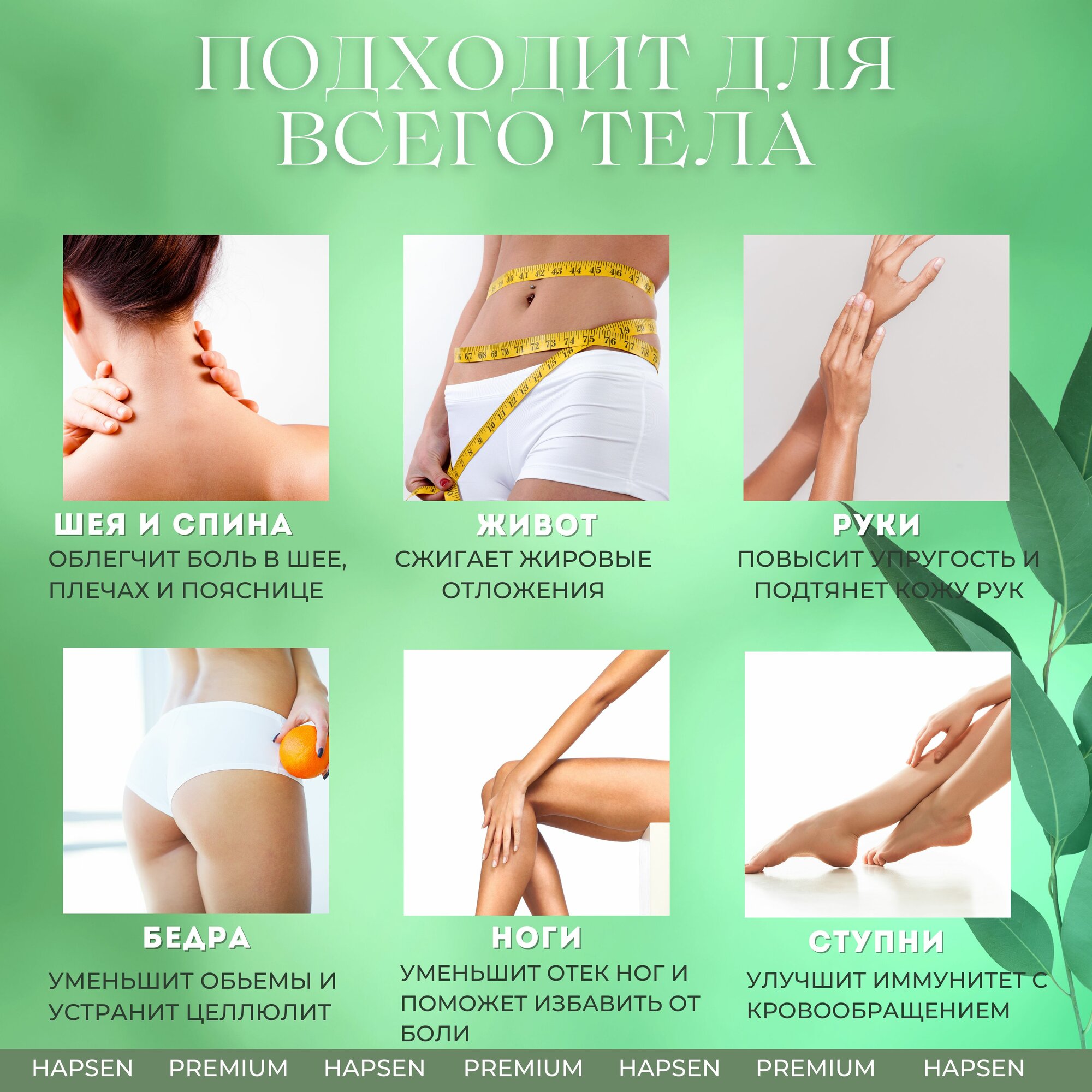 | Зона массажа | бедра / голени / грудная клетка / декольте / живот / ноги / плечи / поясница / руки / спина / талия / тело / ягодицы |