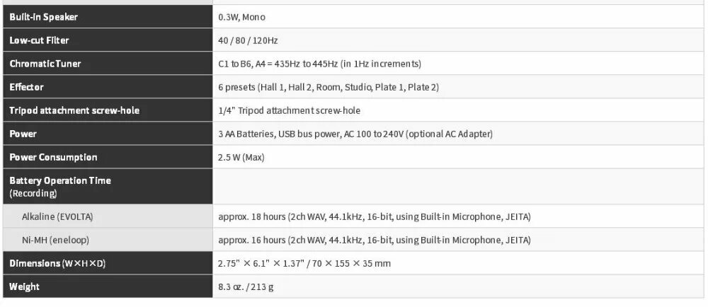 | Особенности | MP3, WAV, Форматы записи: BWF, от батареек |