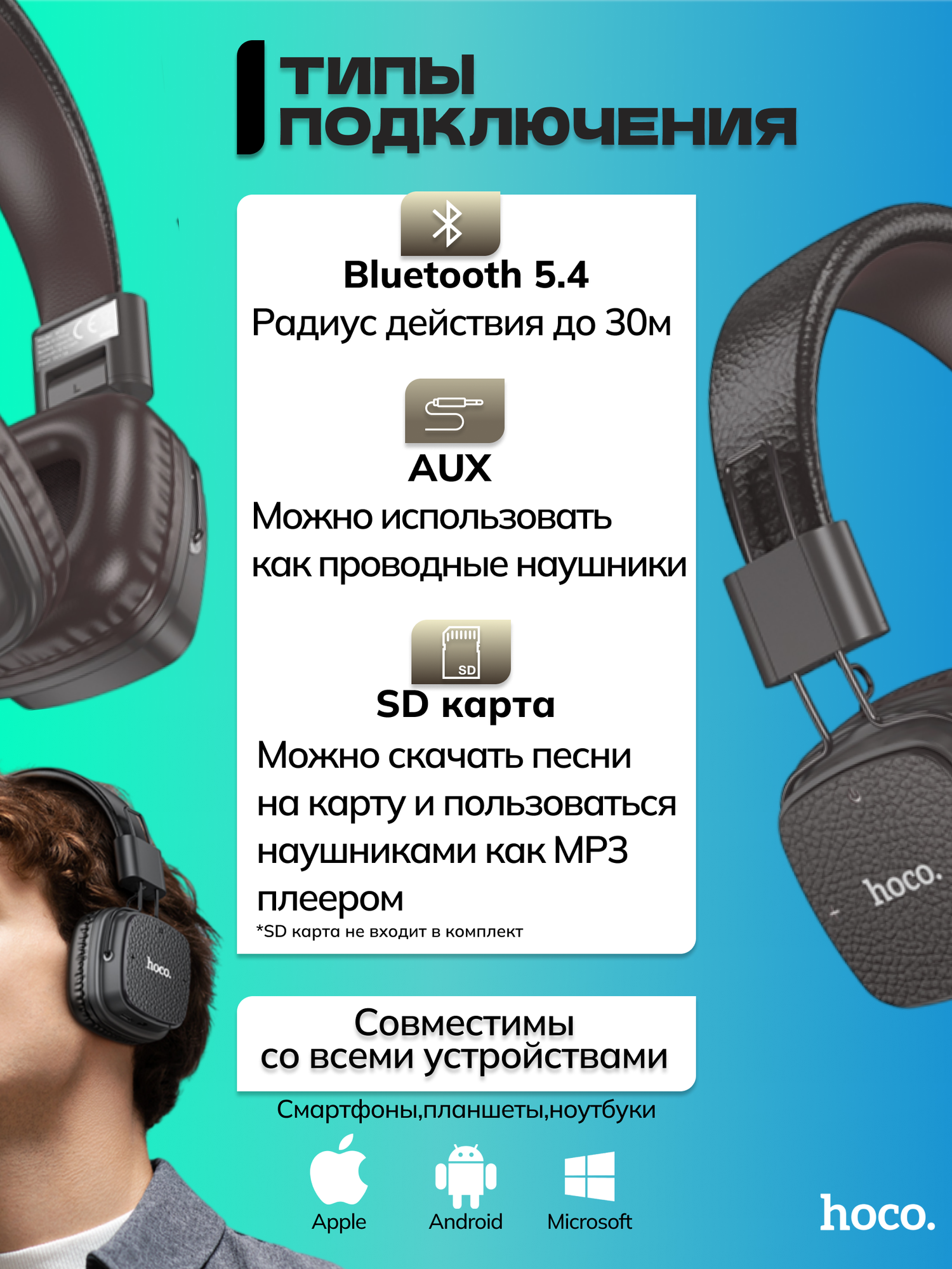 Беспроводной полноразмерный Bluetooth-наушник Hoco с технологией Bluetooth 5,4 Коричневый интересное: