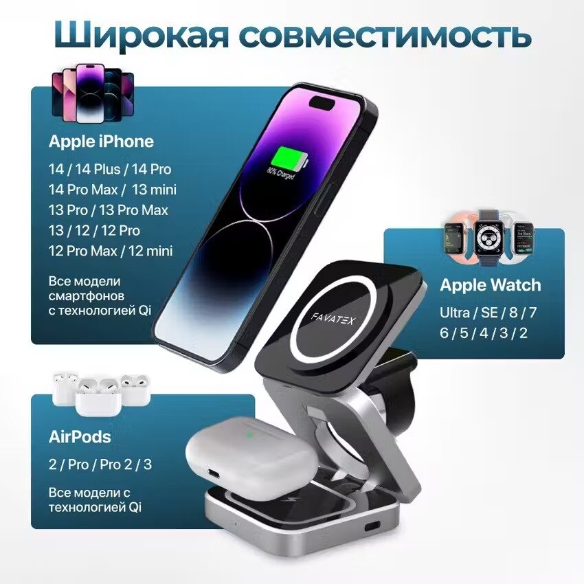 | Список совместимых устройств | iPhone, AirPods и Apple Watch с поддержкой беспроводной зарядки. |