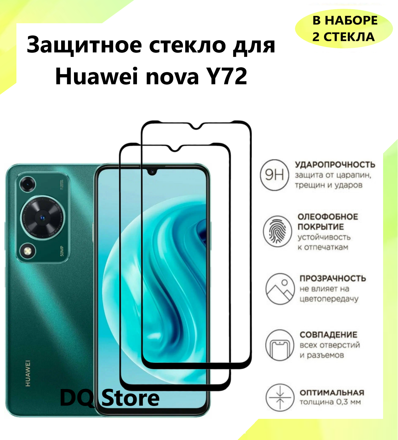 Купить 2 Защитных стекла на HUAWEI nova Y72 / Хуавей нова У72 . Полноэкранные защитные стекла с олеофобным покрытием