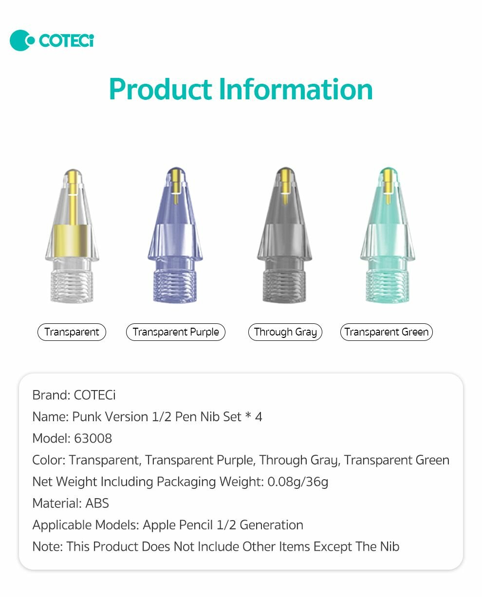 | Комплектация | Наконечники для Apple Pencil 4 шт COTECi Разноцветные |