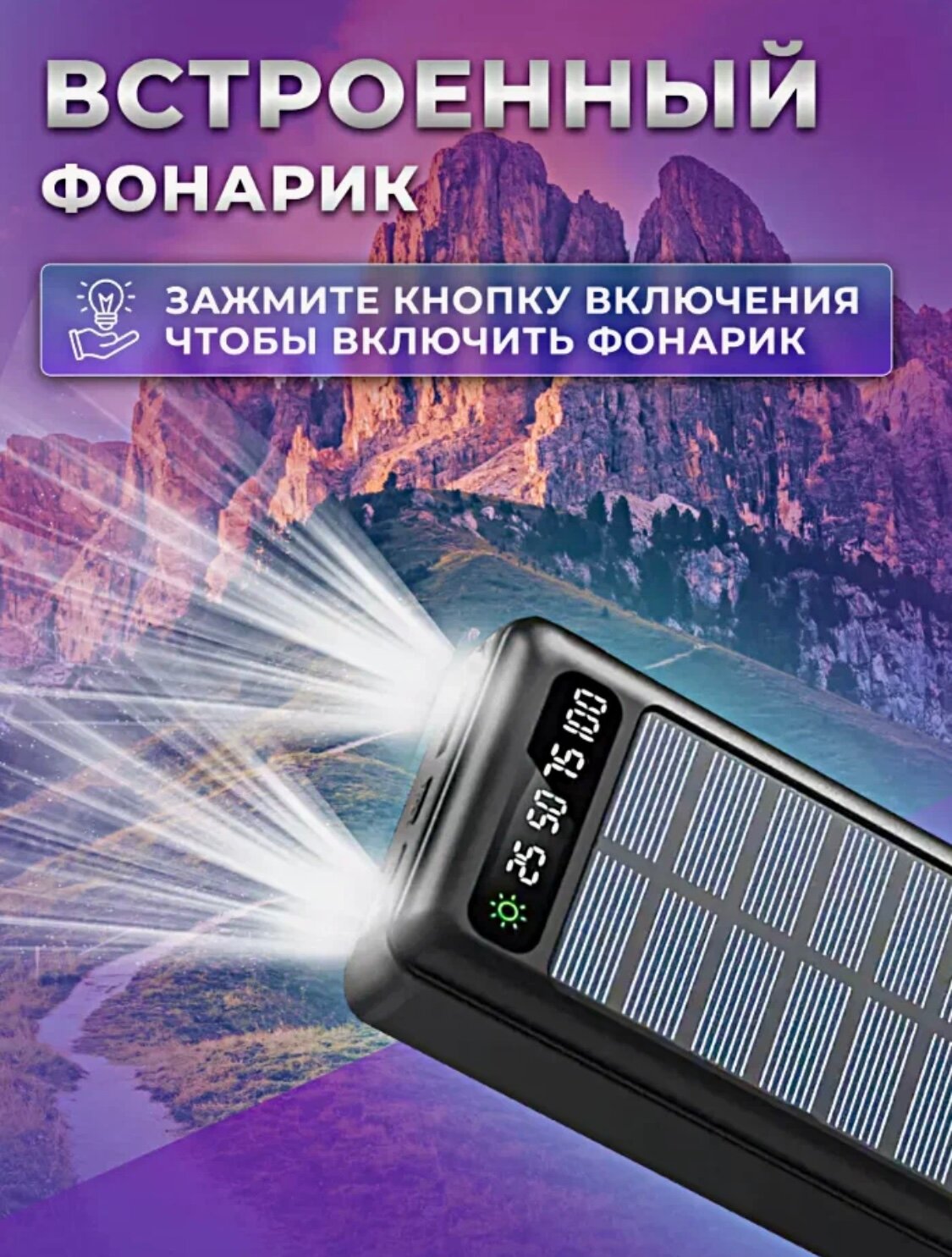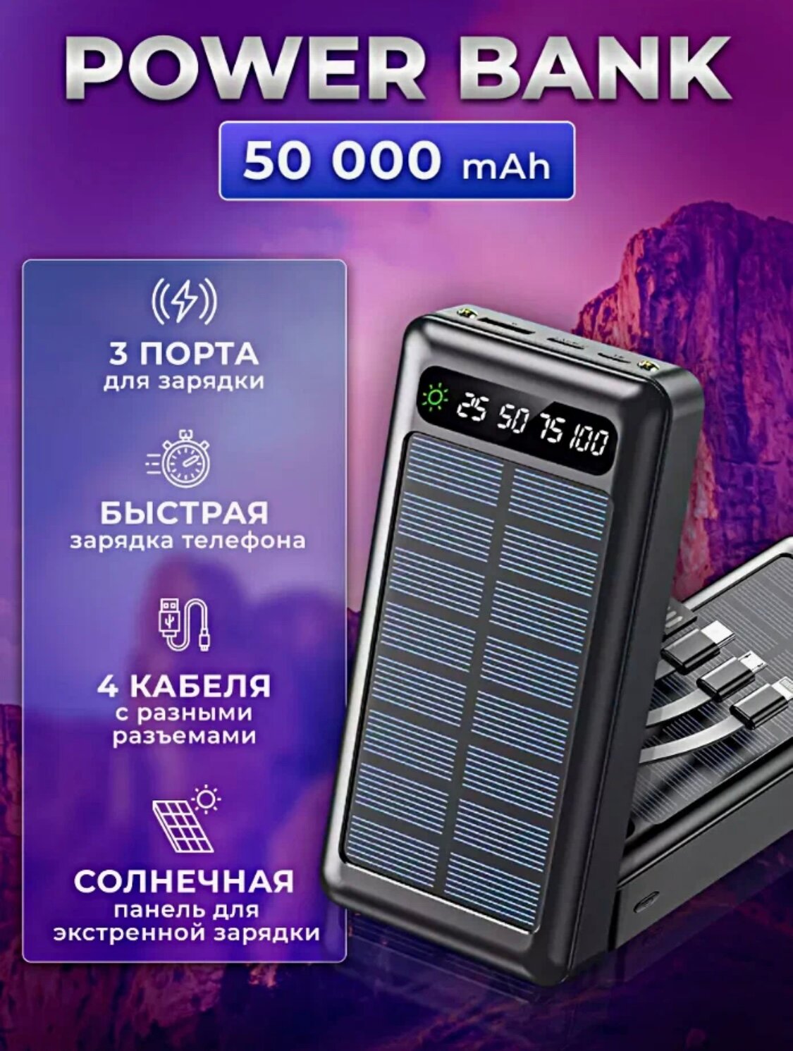 Powerbank "SOLAR ENERGY" 50000 mAh со Встроенными кабелями, Cолнечная батарея/Power bank solar energy/ внешний аккумулятор интересное: