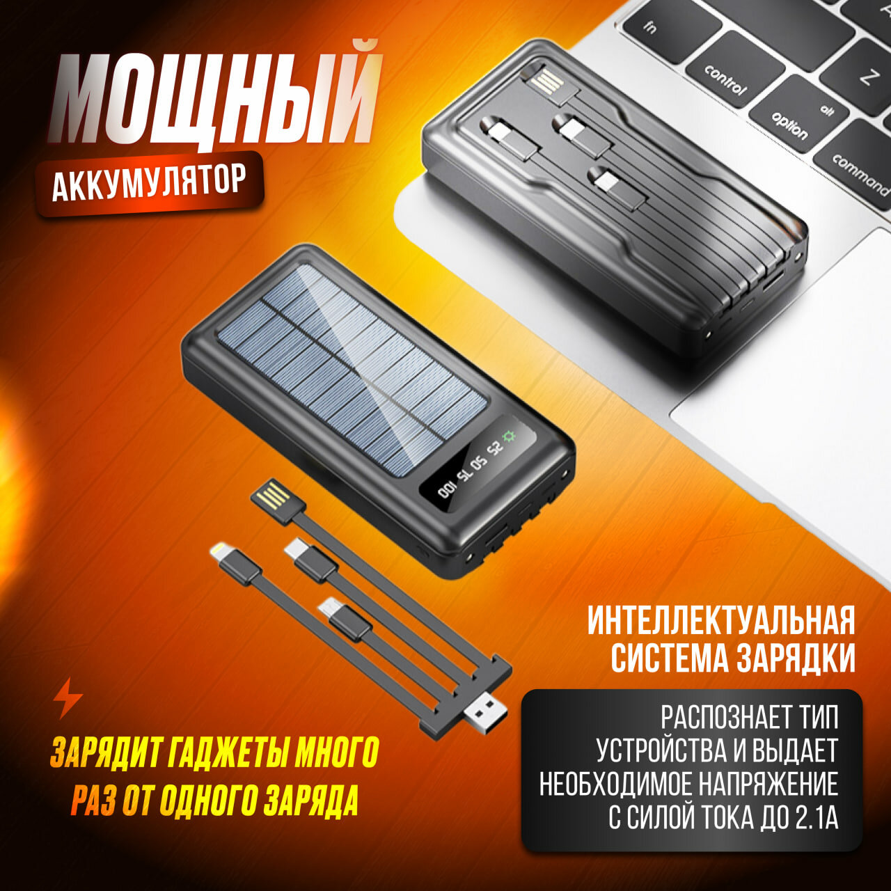 Мощный портативный повербанк 50000mAh, Внешний аккумулятор, встроенные кабеля, солнечная батарея, фонарик, черный интересное: