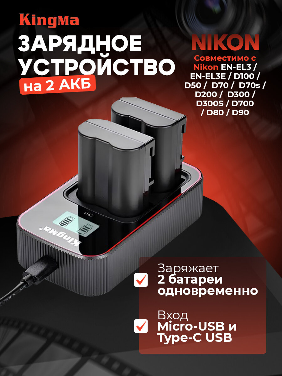 Зарядное устройство KingMa c дисплеем и двумя слотами для аккумуляторов Nikon EN-EL3E.