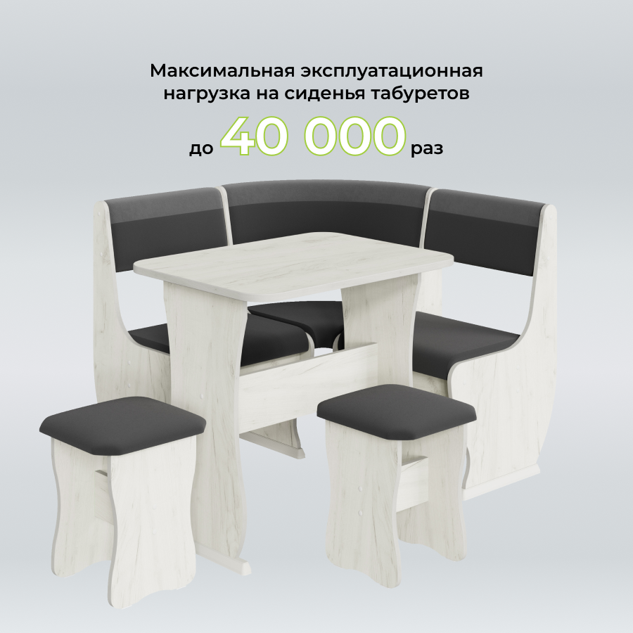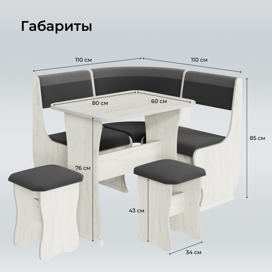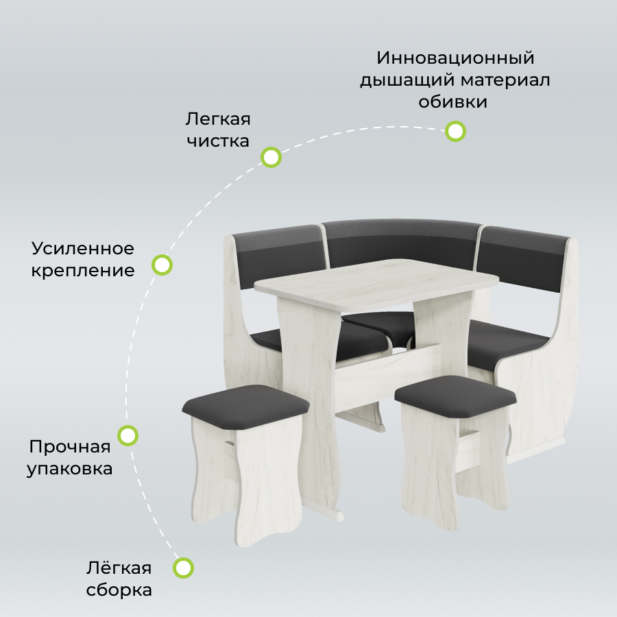 | Комплектация | стол - 1 шт, скамья угловая с нишами для хранения - 1 шт, табурет - 2 шт, фурнитура, паспорт изделия. |