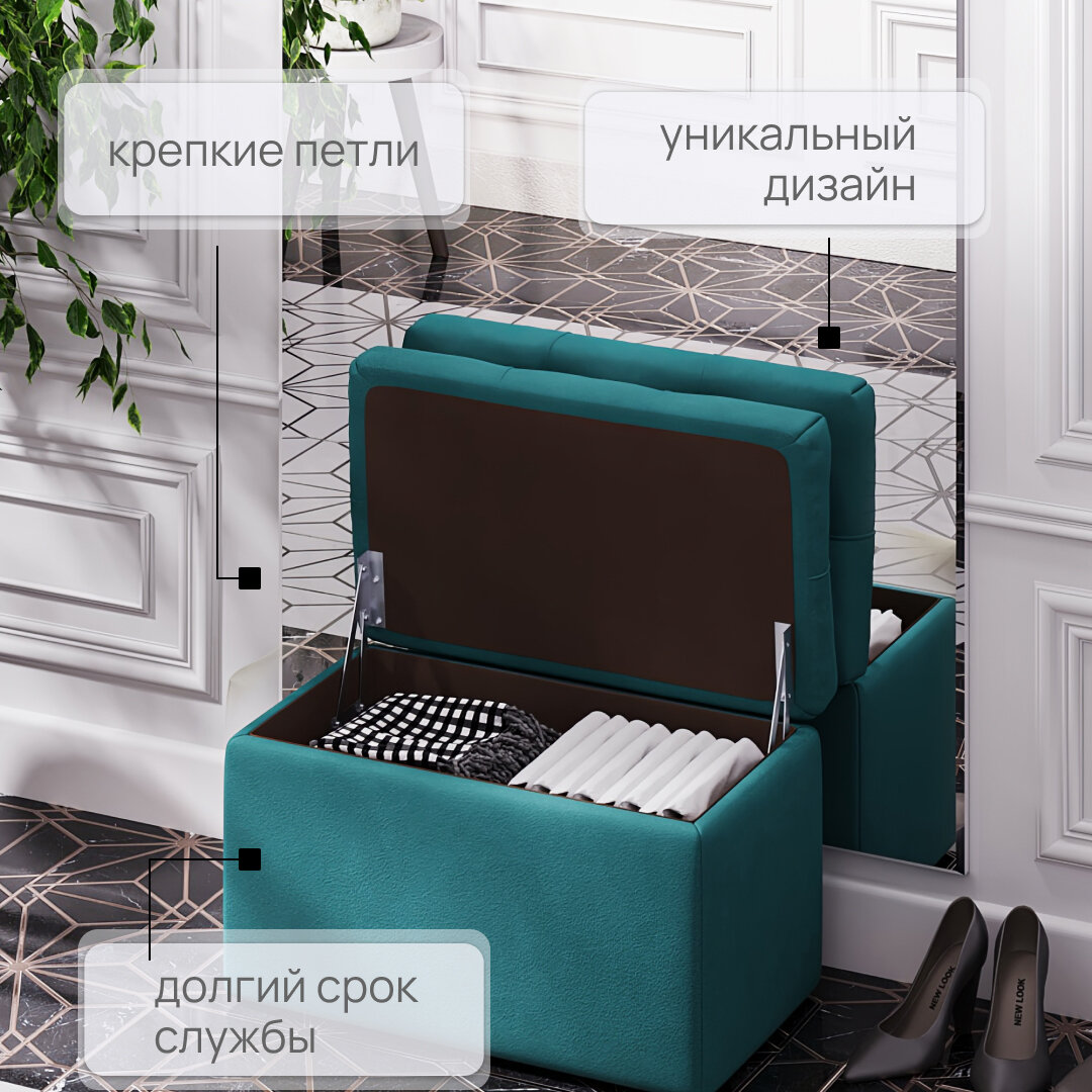 Купить Банкетка, пуф, с ящиком для хранения, с механизмом, открывной, "Мечта", бирюзовая, зеленая, микровелюр, мягкий, квадратный, 60x35x40, в гостинную, в прихожую, в спальню, в коридор, подставка под ноги, к креслу