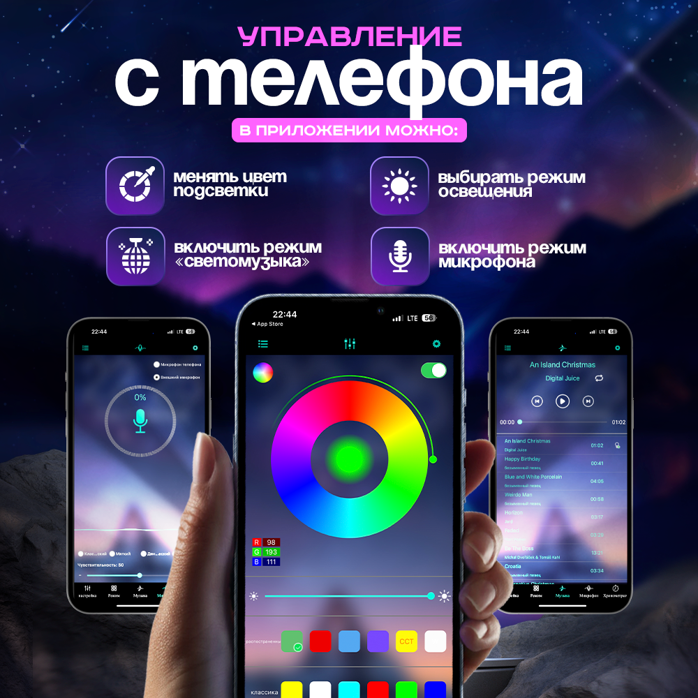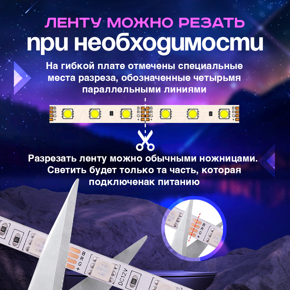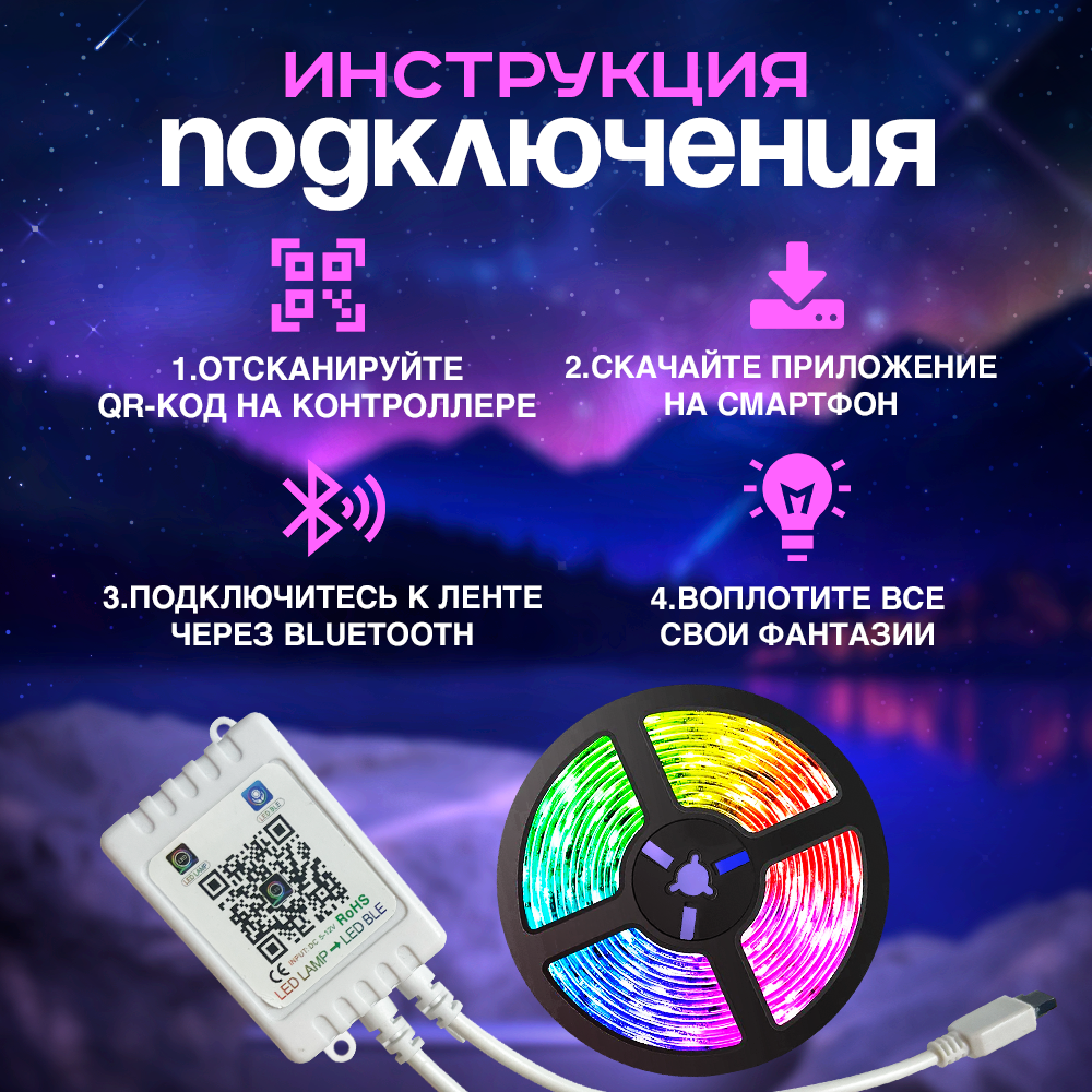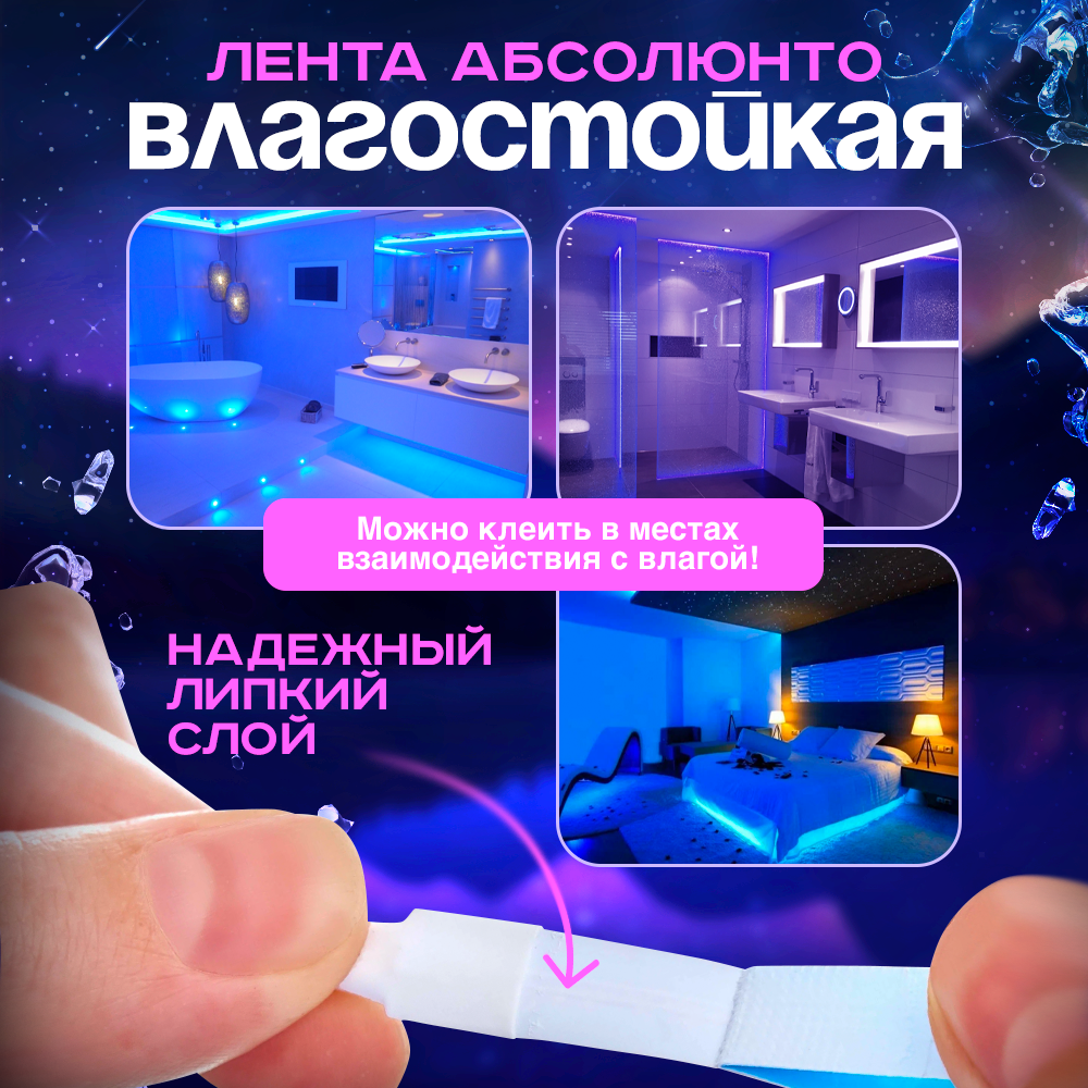 | Особенности | RGB-контроллер в комплекте / герметизация / режим ночника / самоклеящаяся основа / термостойкая |