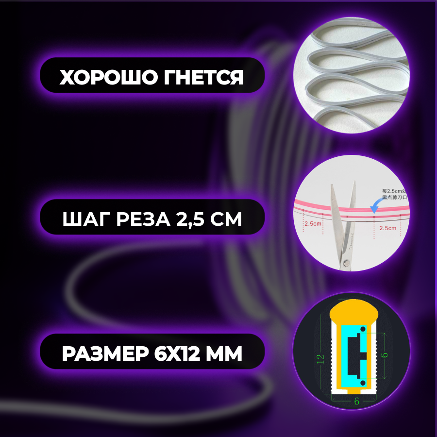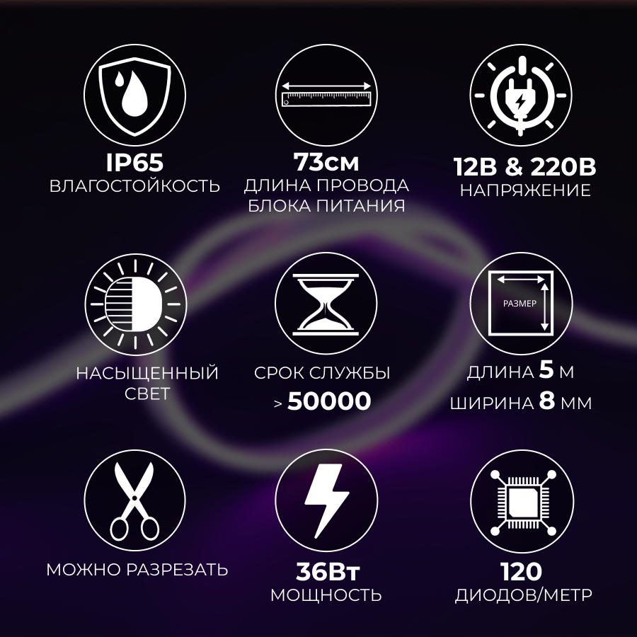 Неоновая светодиодная лента, фиолетовый свет, 5 метров, с блоком питания, гибкий неон интересное: