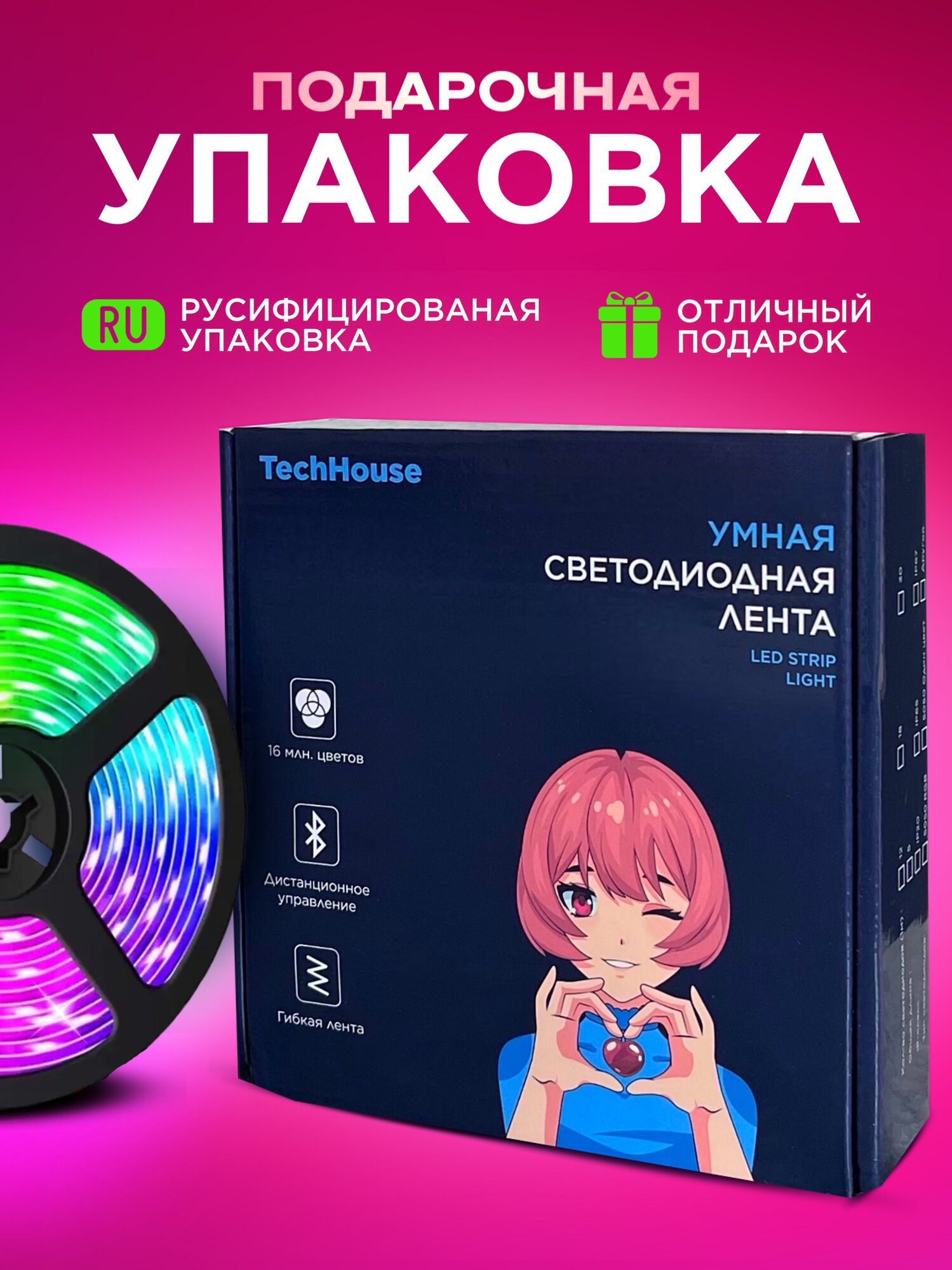 Светодиодная лента TechHouse, 10 метров, с пультом и управлением со смартфона, RGB LED
