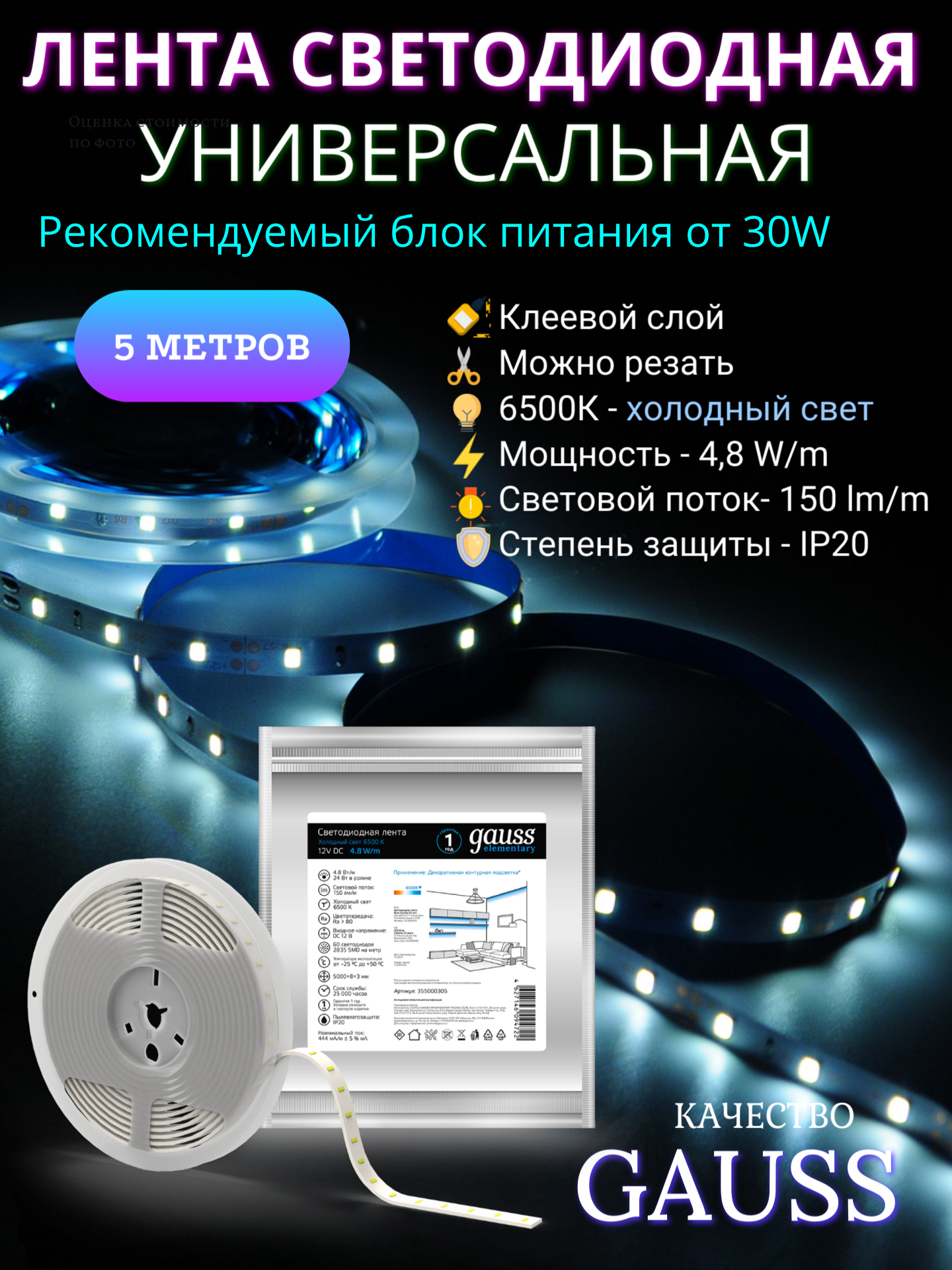 СохранитьЛента светодиодная 2835/60 12V 4.8W 6500K 8mm IP20 5m Gauss Elementary интересное: