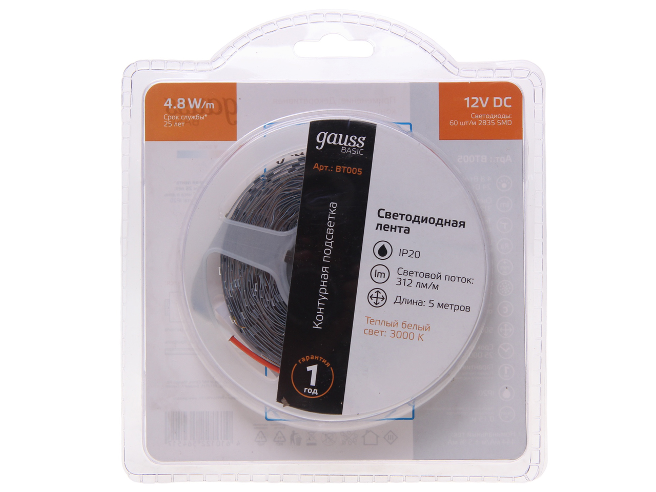 СохранитьЛента светодиодная 2835/60 12V 4,8W/m 312lm/m 3000K 8mm IP20 5m Gauss Basic интересное: