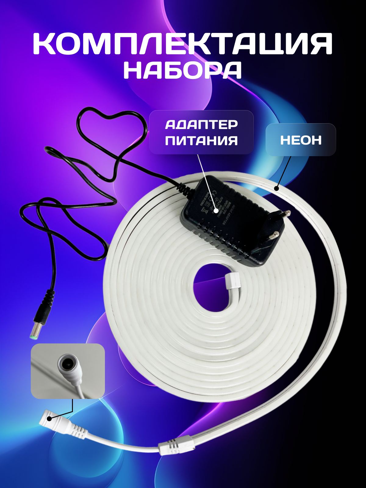 Купить Светодиодная лента, гибкий неон, холодный белый, 5м, 12В, IP65, 120 LED/m+ блок питания12V, 220В,