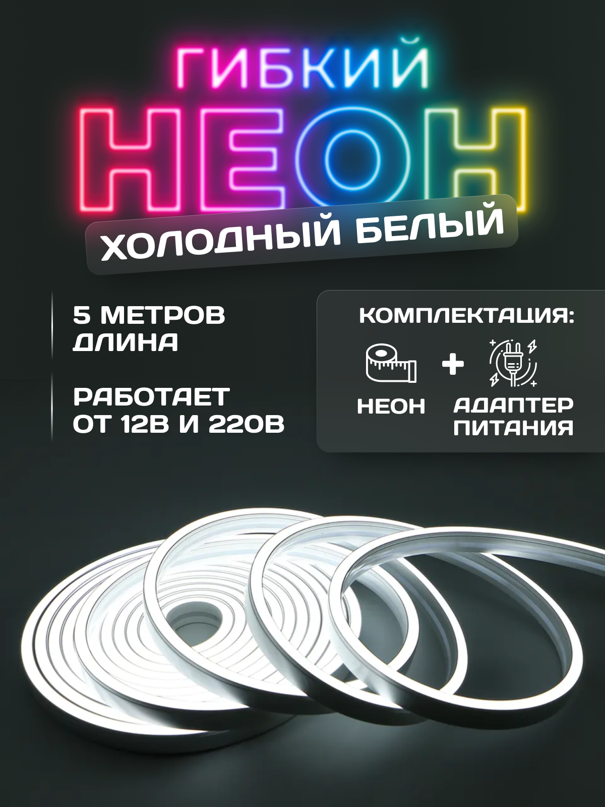 Светодиодная лента, гибкий неон, холодный белый, 5м, 12В, IP65, 120 LED/m+ блок питания12V, 220В, интересное: