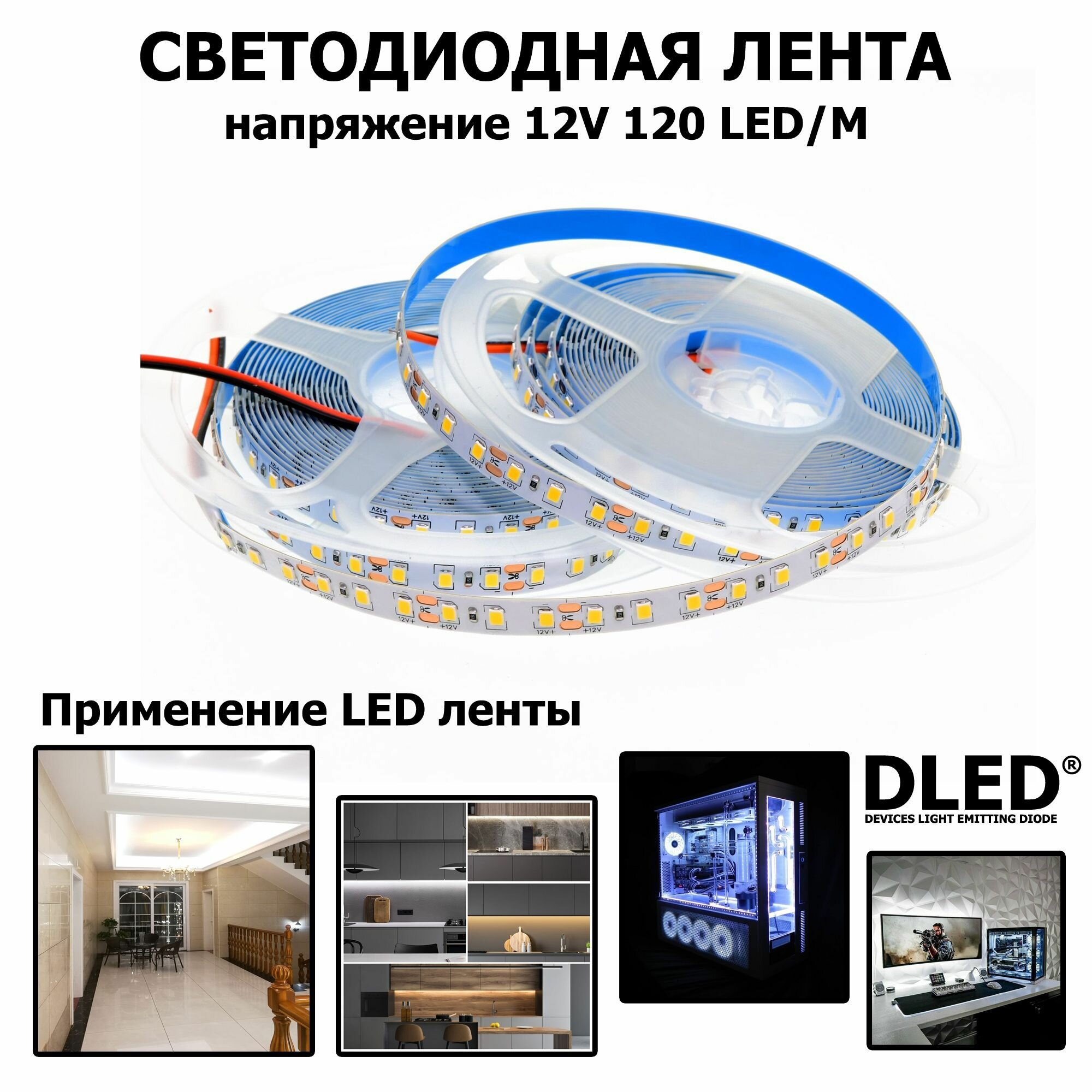 LED лента на SMD 2835 IP22 (120 LED) 12V DC 48W Холодный Белый 6500K 5 метров Бренд DLED
