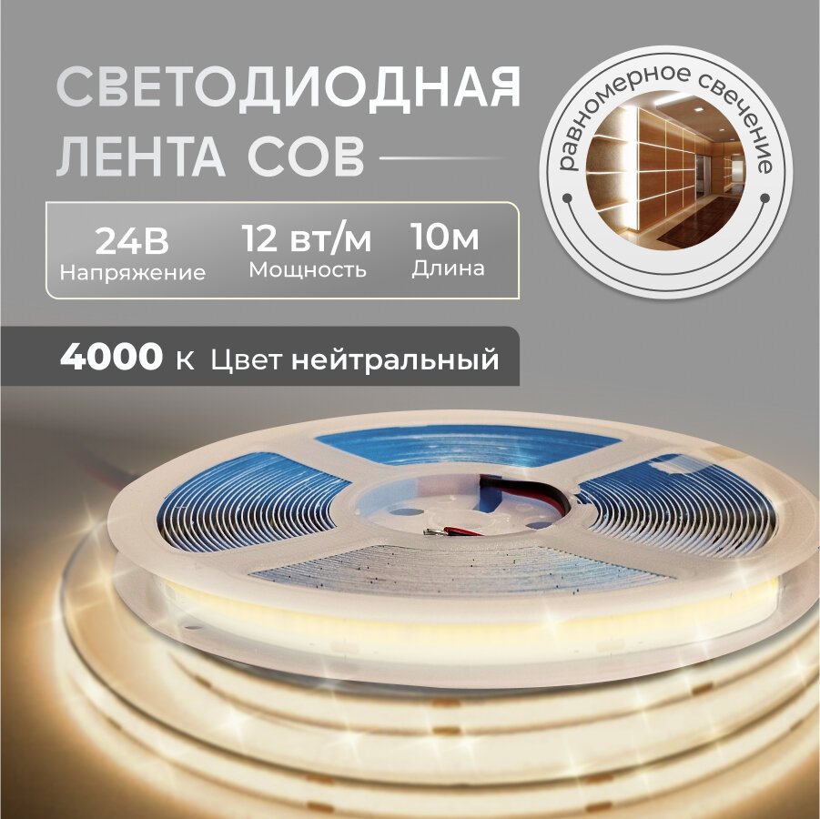 Светодиодная лента, сплошное COB, 10 метров, 24В, IP20, 320 LED/m, 12W/м, 4000к, нейтральный интересное: