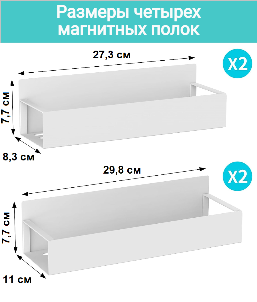 | Комплектация | Магнитная полка 29,5 см х 9,5 см х 7,5 см - 1 шт. Магнитная полка 27 см х 8,5 см х 7,5 см - 1 шт. |