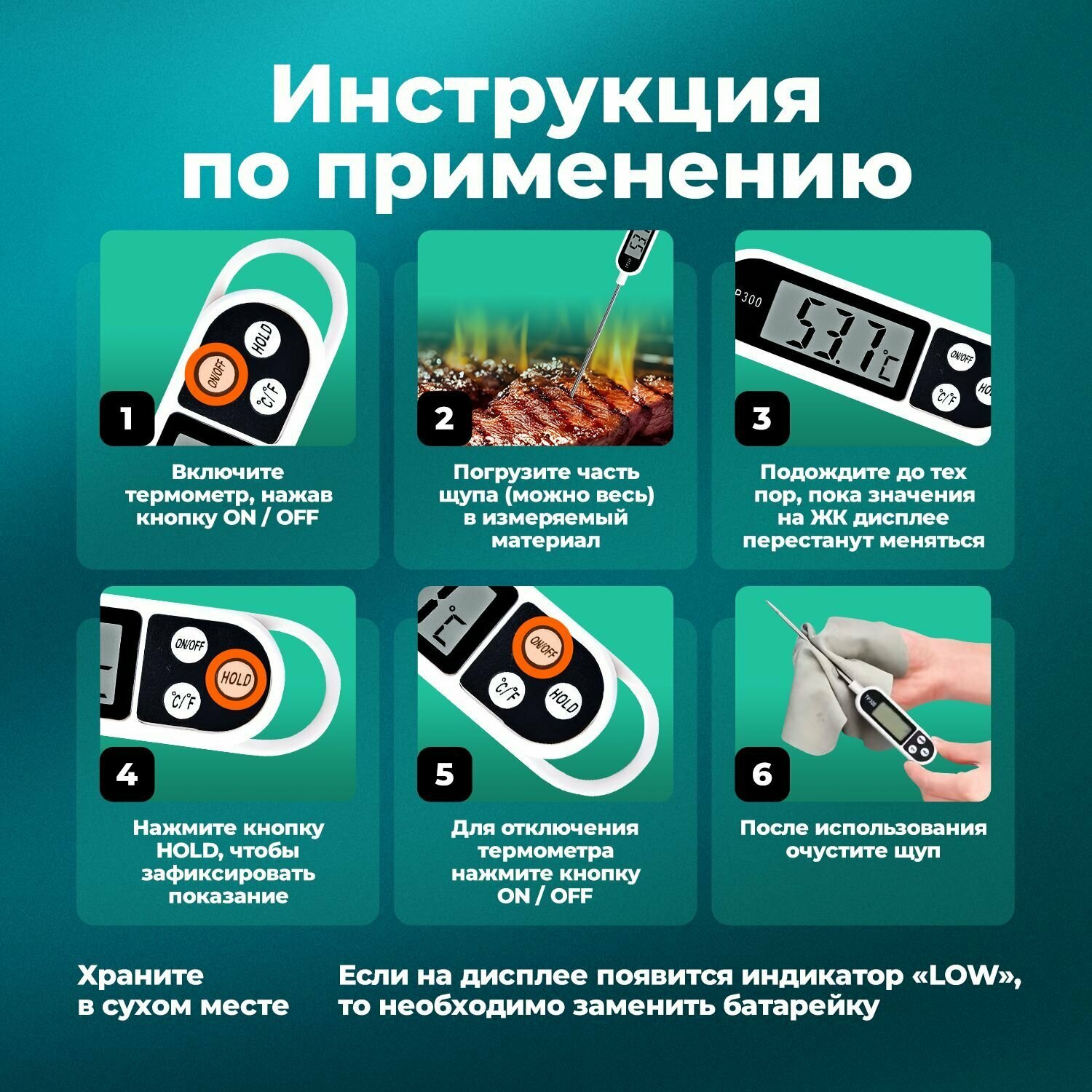 | Дополнительная информация | Кулинарный термометр с щупом 1 шт, силиконовый колпачок 1 шт, батарейка 1 шт |