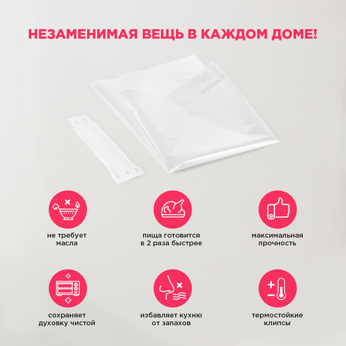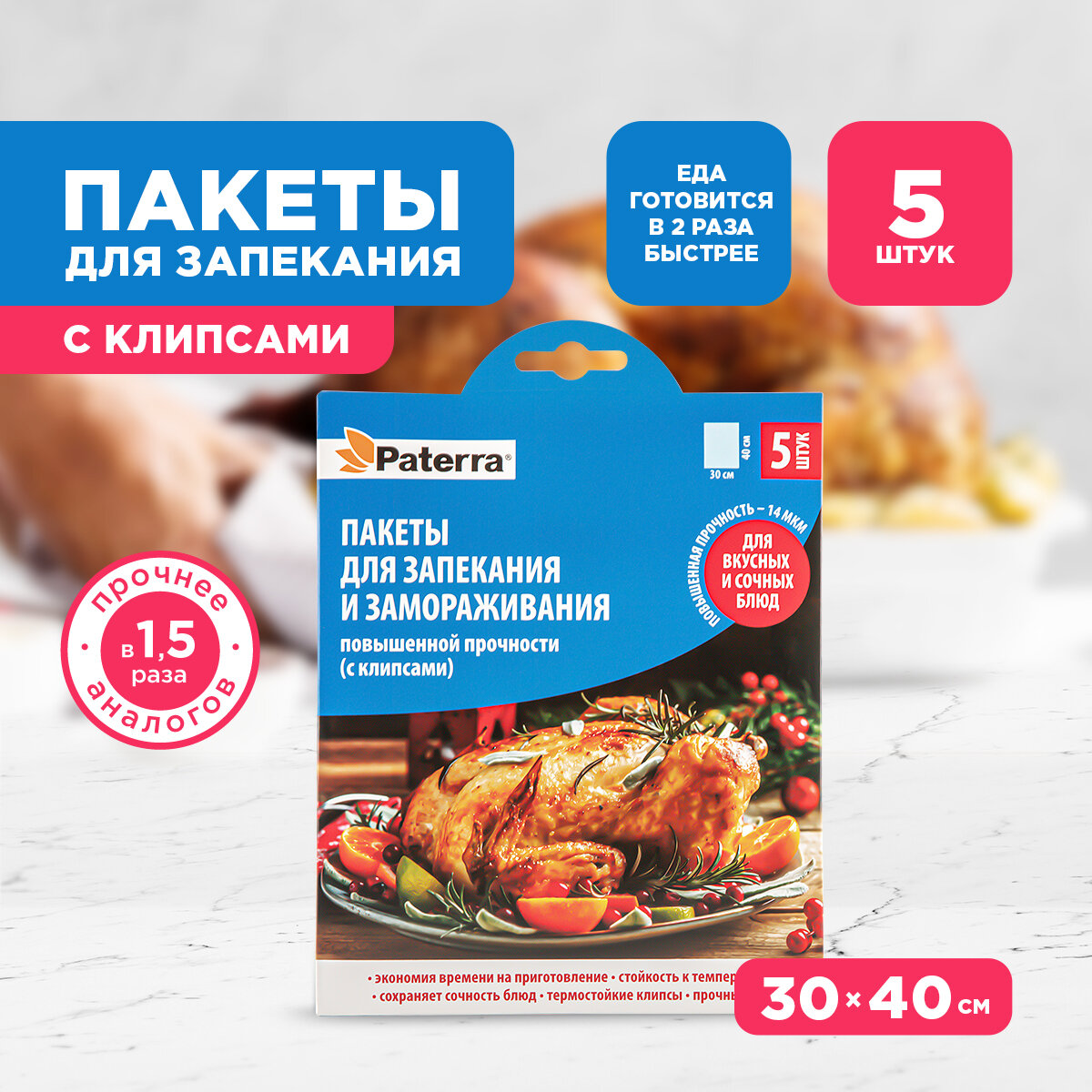 Пакеты для запекания, размер М - 30 см х 40 см., 5 шт. в упаковке, 12 мкм, с термостойкими клипсами, PATERRA интересное: