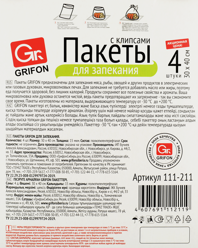 Купить Пакет.для запек.Grifon 30*40см 4шт 111-211 с клипсами