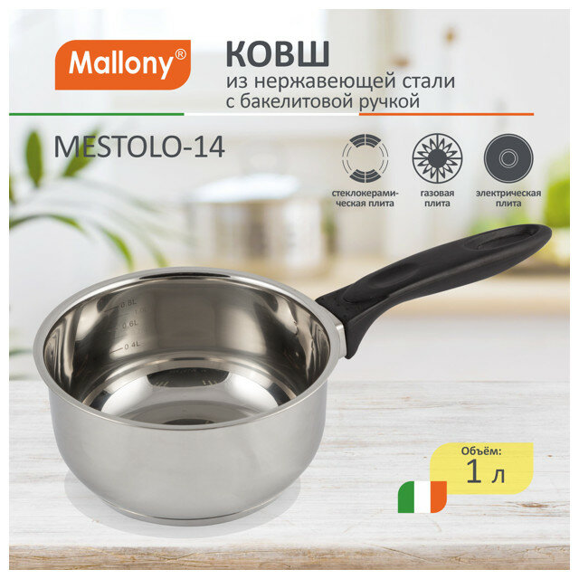 | Дополнительная информация | Ковш MALLONY Mestolo 14см 1л нерж сталь бакелитовая ручка |