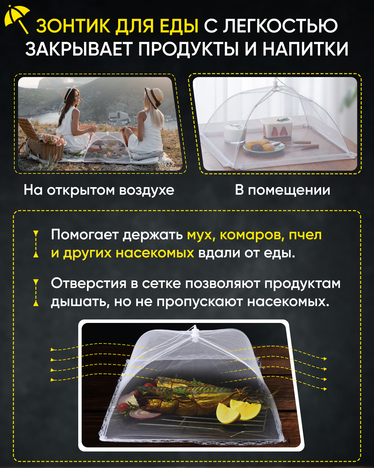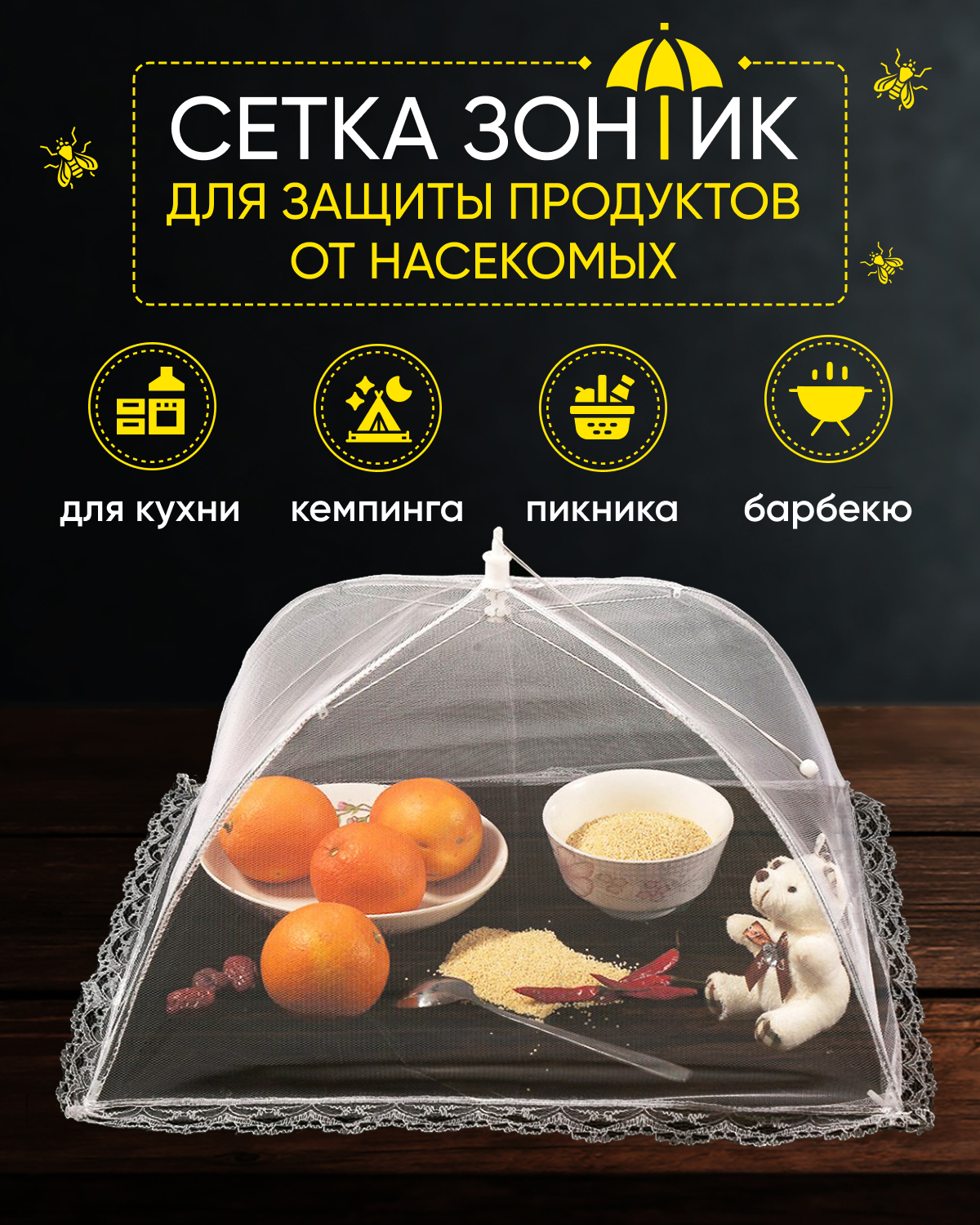 | Дополнительная информация | сетка на стол от мух; от насекомых; москитная сетка; на дачу; для еды; от пчел; сетка-зонтик; антимоскитная; антипыль; |