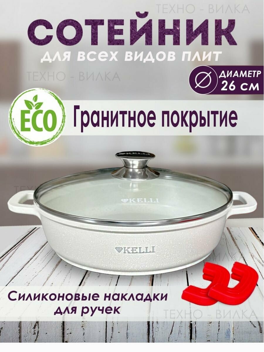 Купить Сотейник техно-вилка KELLI с крышкой, гранитное покрытие, 26 см, белый