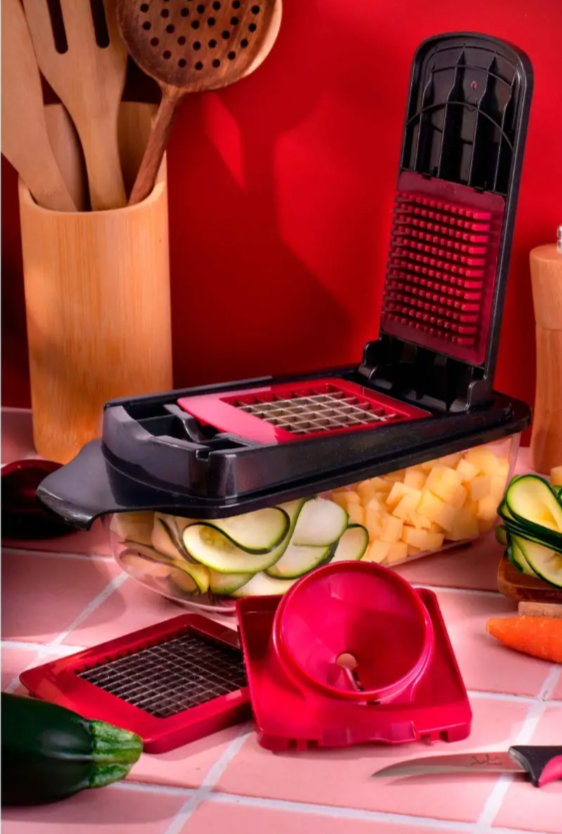 | Комплектация | Особенности терки: 1. V-образное лезвие, которое позволит нарезать продукт тонкими слайсами. 2. Еще 2 дополнительных ножа для нарезки долек разного размера. Контейнер для удобного сбора нарезки |