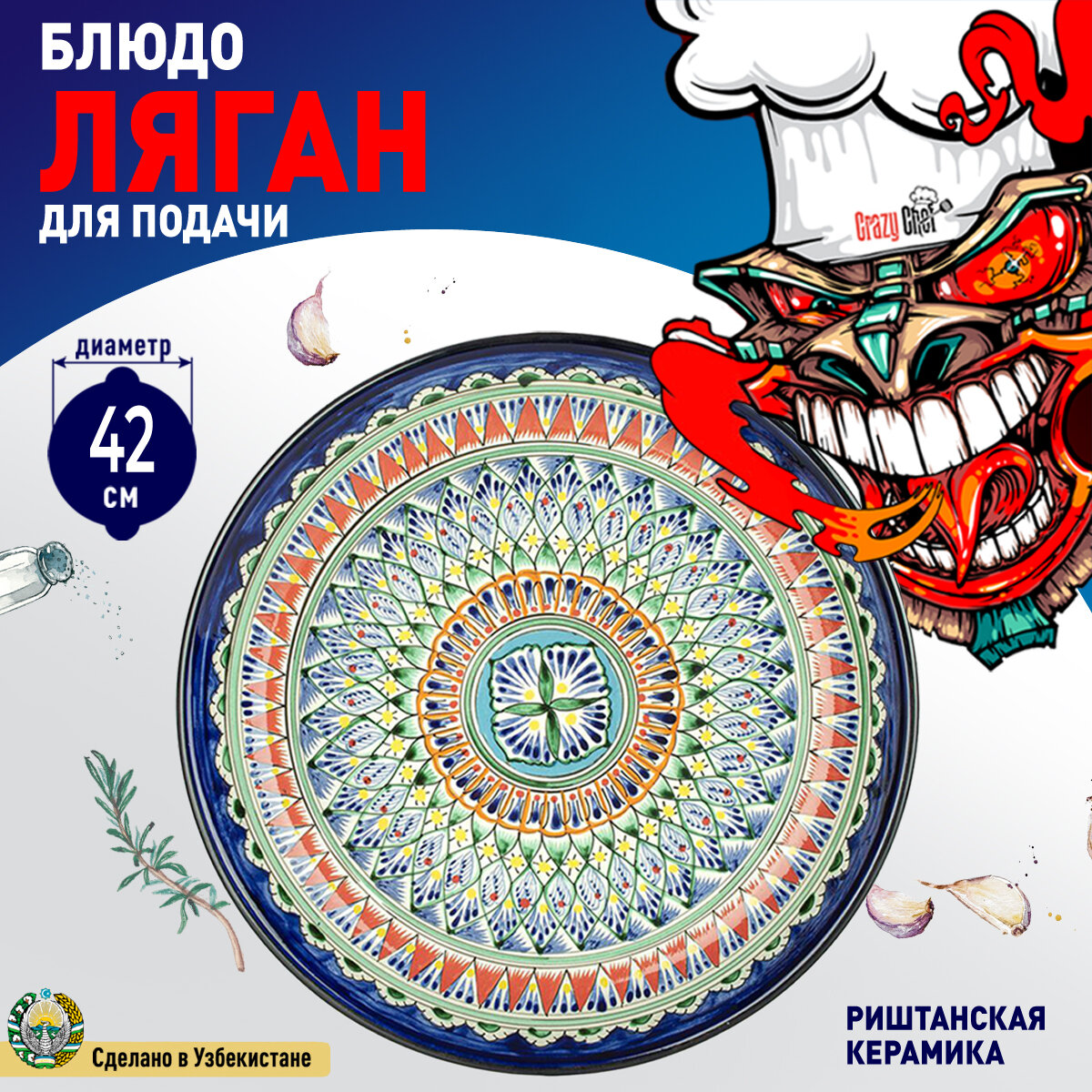 Блюдо Ляган "Риштанская Керамика", диаметр 42см (Цвет: Синий Орнамент) интересное: