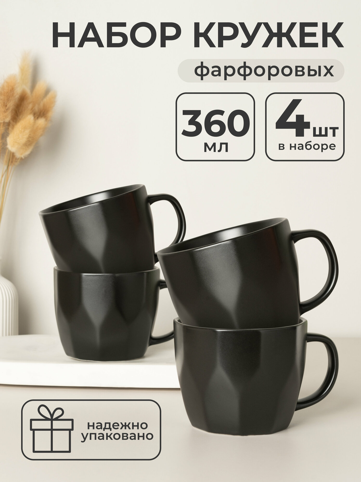 Набор кружек фарфоровых Atmosphere, 360 мл, 4 шт, черный интересное: