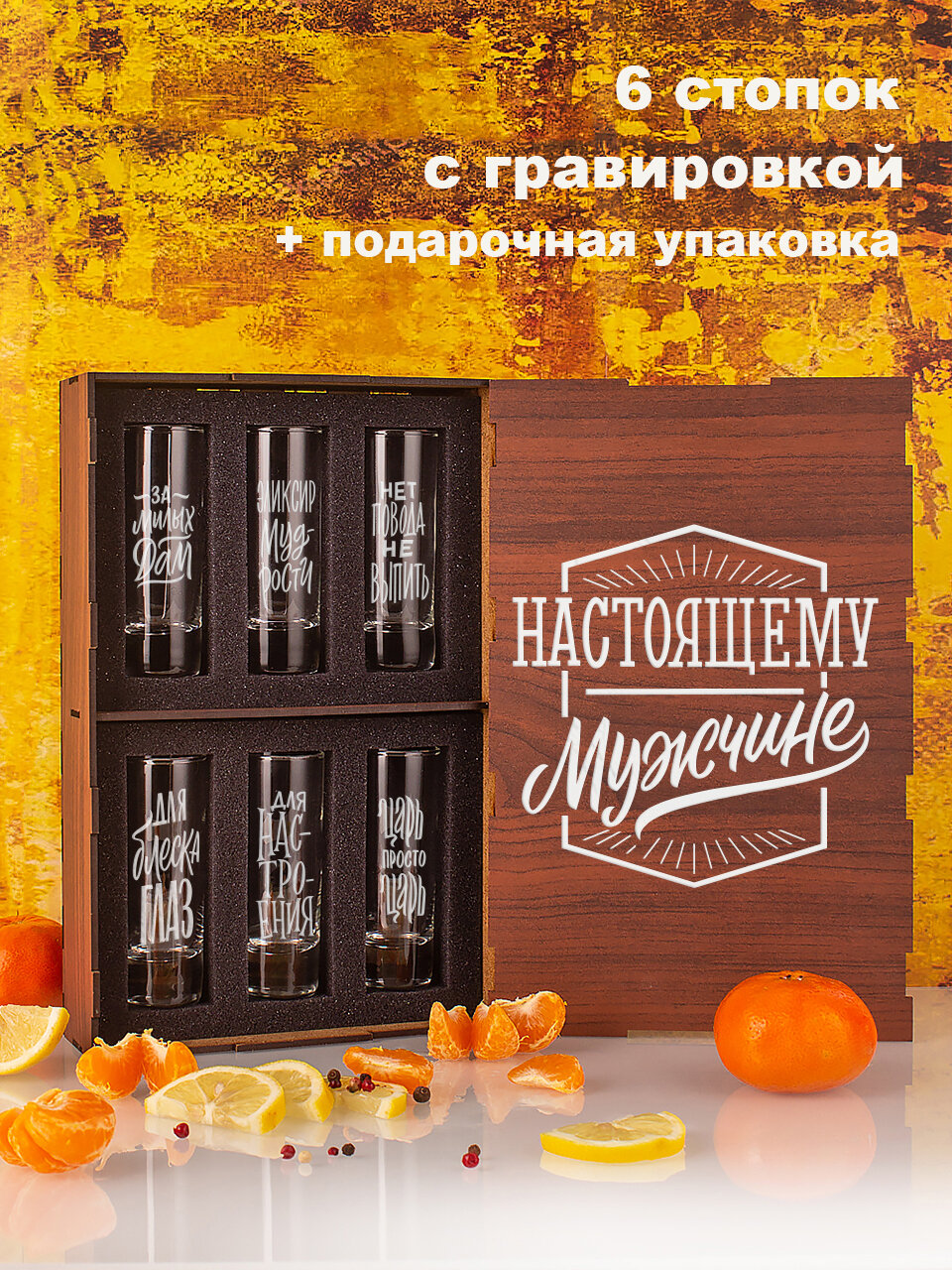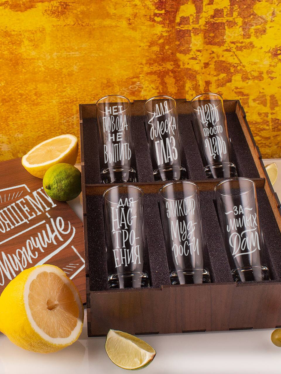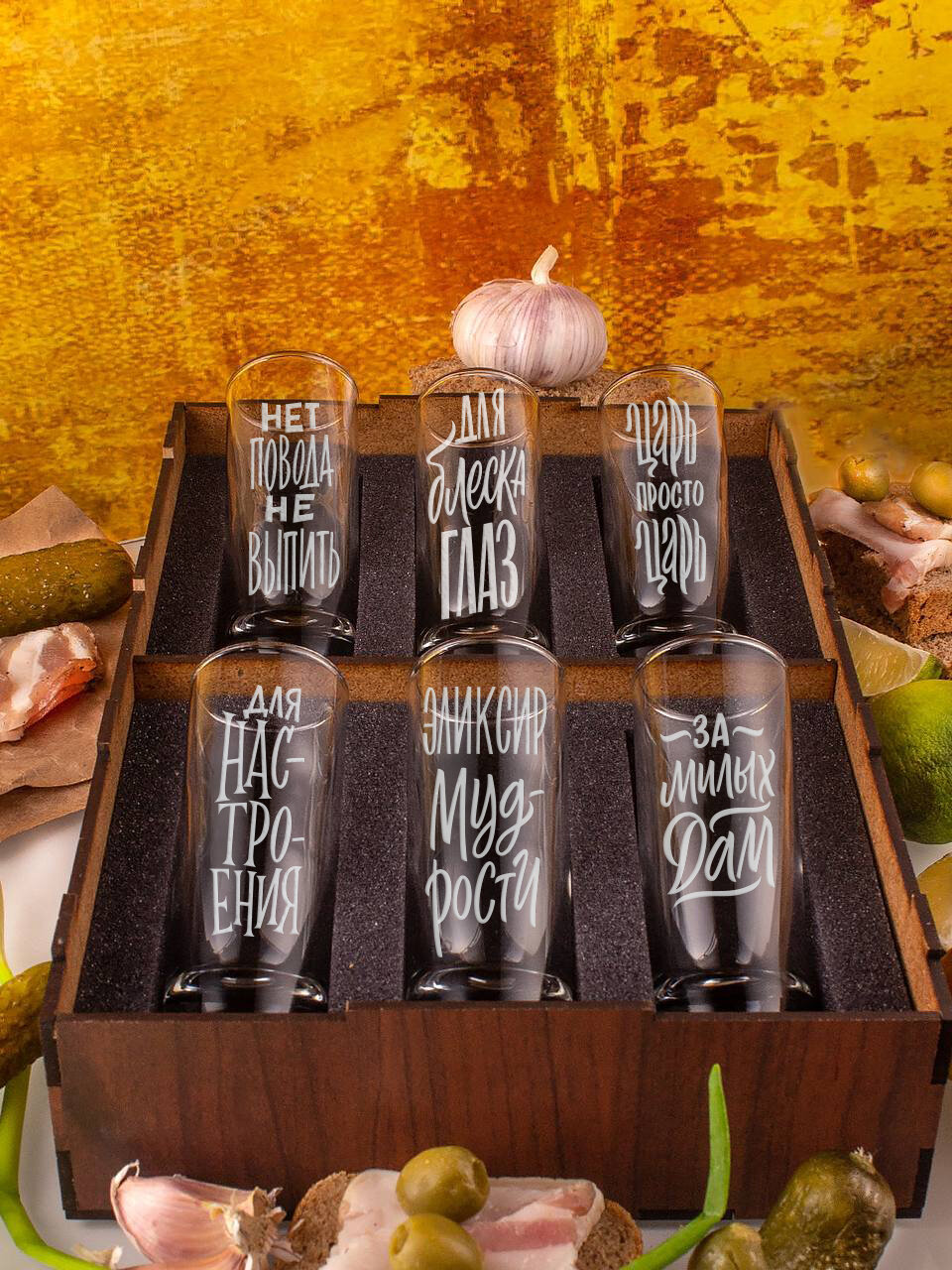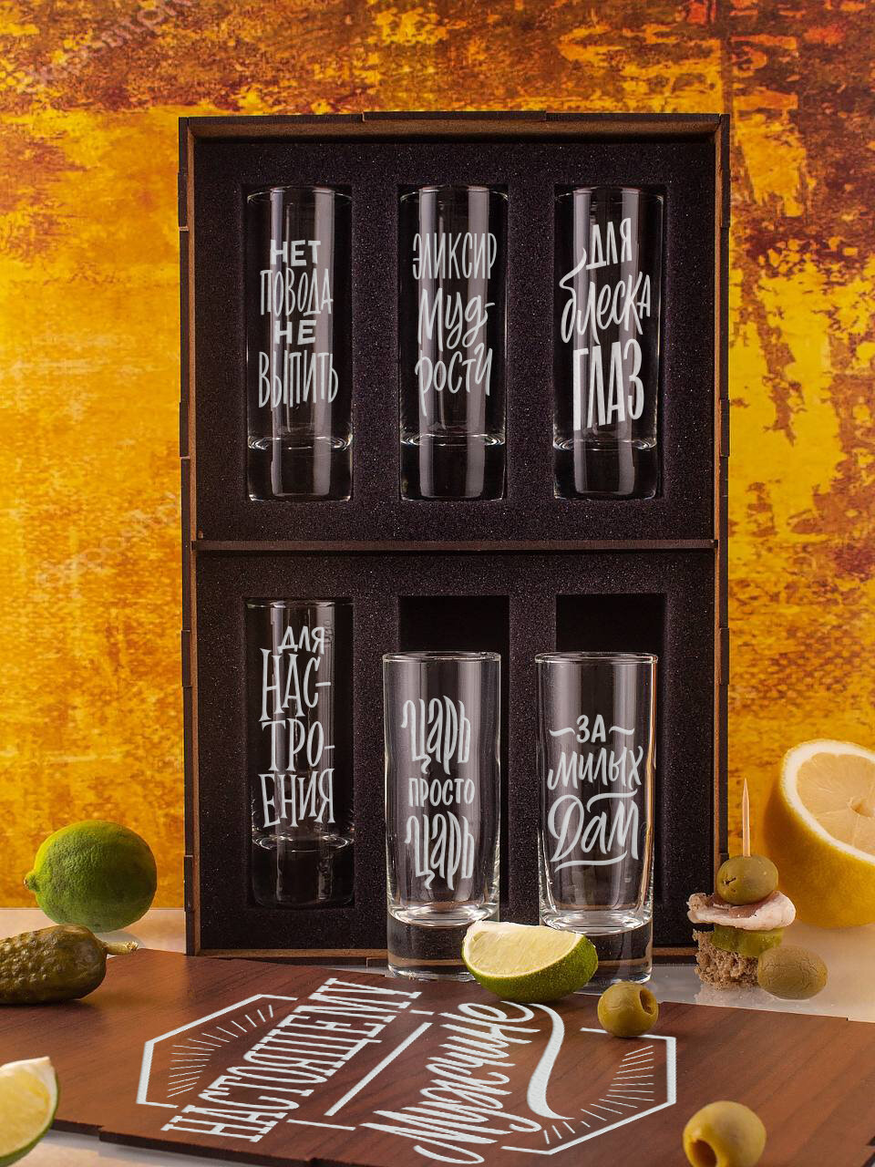 | Комплектация | Стопка для водки с гравировкой 6 шт., Подарочная коробка из МДФ 1 шт. |