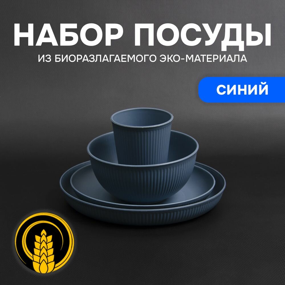 Купить Набор посуды из пшеничной соломы: супница, тарелка*2, стакан (синий)
