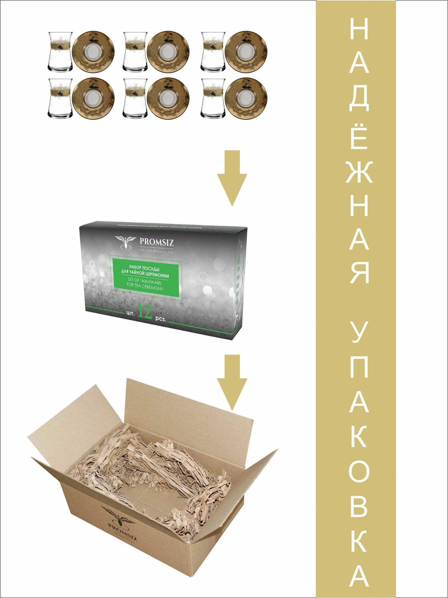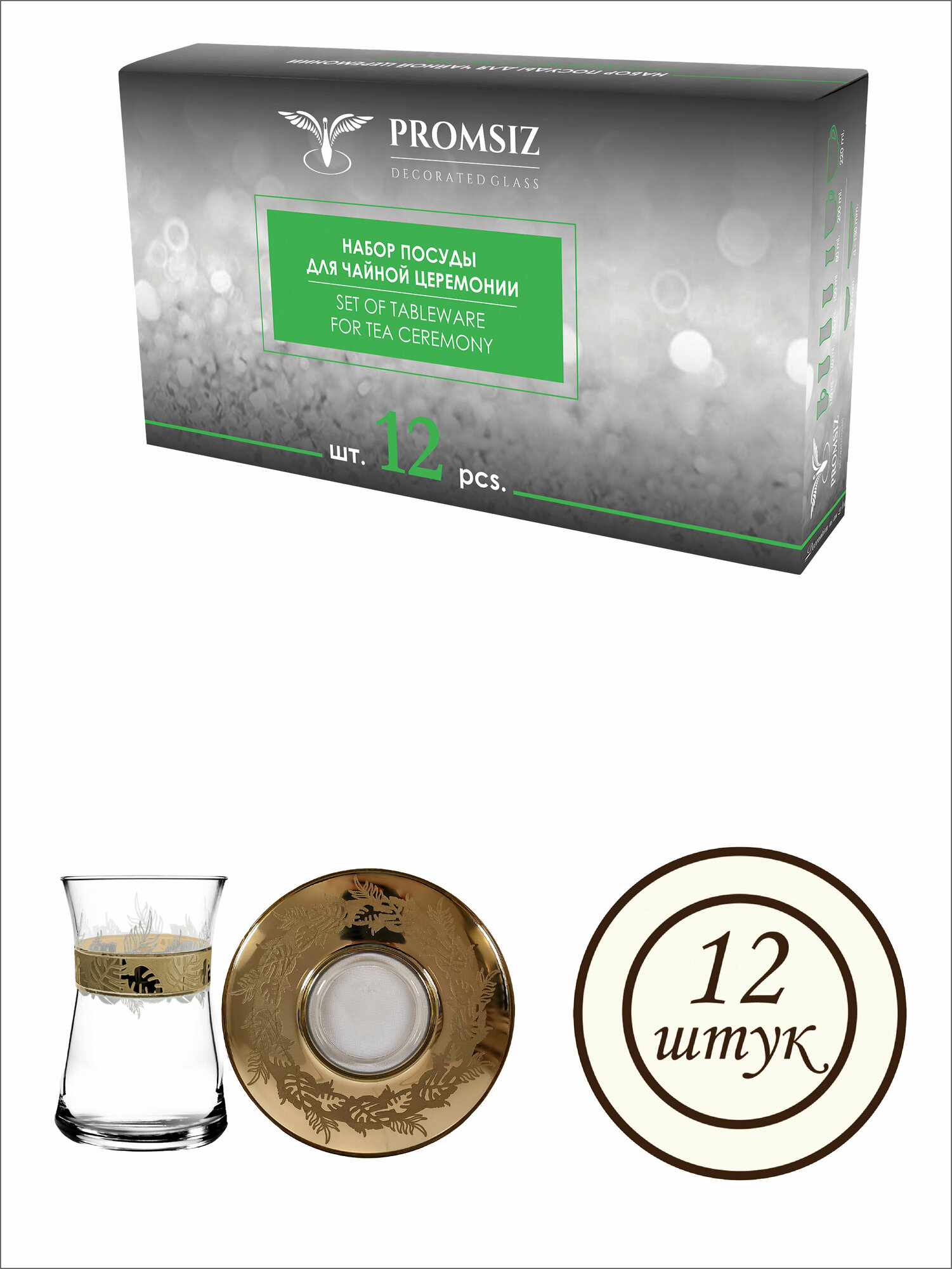 Подарочный набор турецких стаканов с блюдцами для чая / кофе, Армуды с алмазной гравировкой PROMSIZ ирбис / 12 шт. интересное: