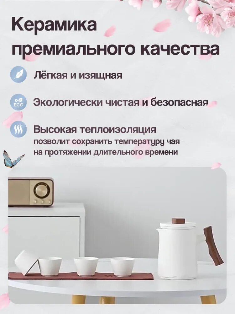 | Комплектация | Заварочный чайник ,4 пиалы ,Сумка для переноски набора ,Тканевая салфетка |