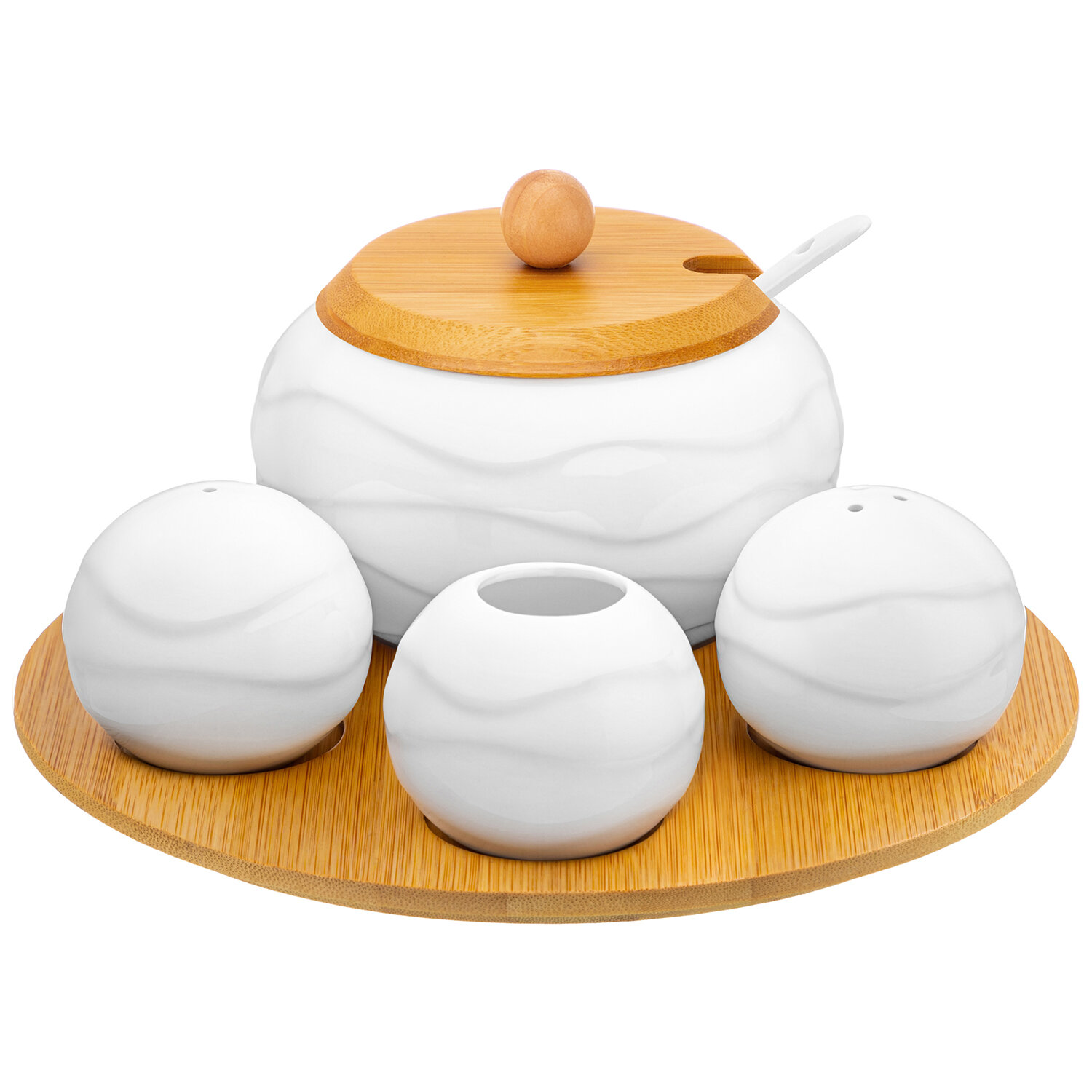 Купить Набор - Сахарница 310 мл Elan Gallery Айсберг волны с ложкой + вазочка под зубочистки + перечница + солонка на дер. подставке