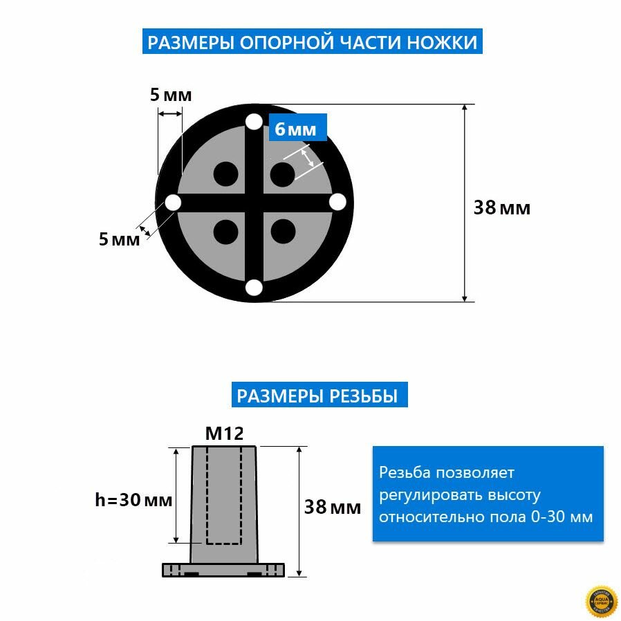 СохранитьНожка, подпятник поддона ванны и джакузи 1 шт., регулируемая пластиковая, внутренняя резьба М12, диаметр опоры 38 мм высота 38 мм, черная производитель ERLIT арт. 1211005003 интересное: