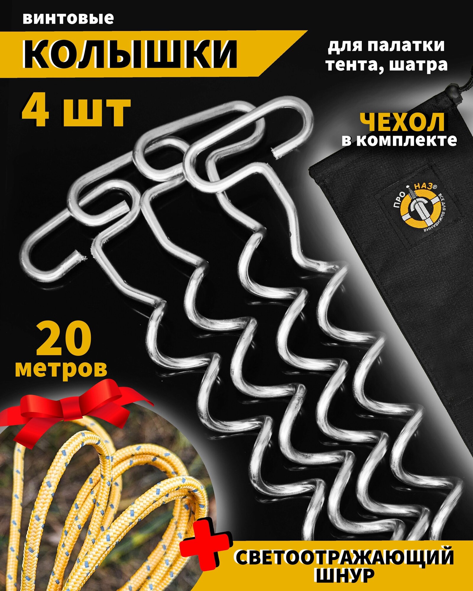 Купить Колышки спиральные (винтовые) для палатки (снег, песок, экстрим) 4шт + чехол + светоотражающий шнур 20м